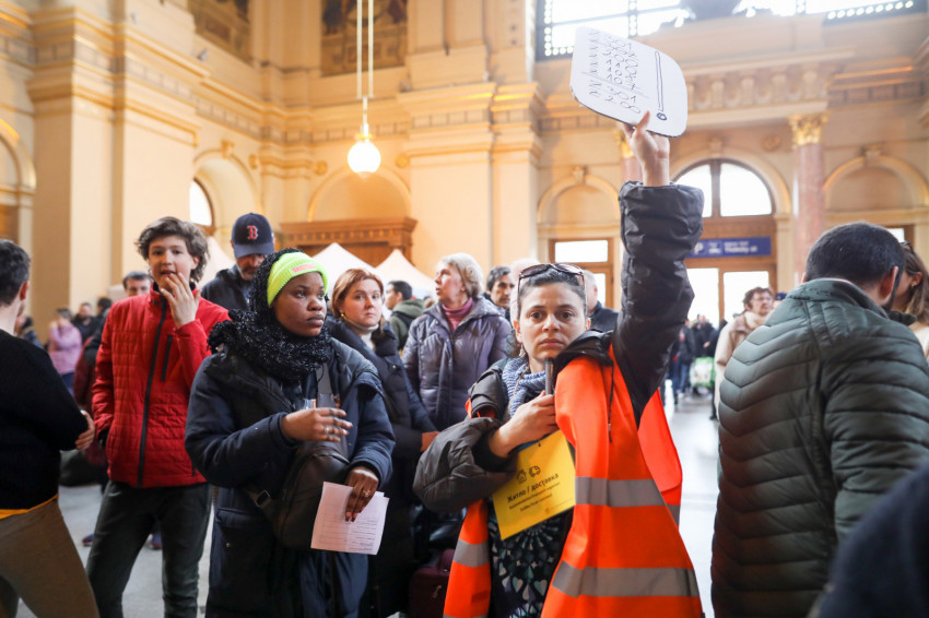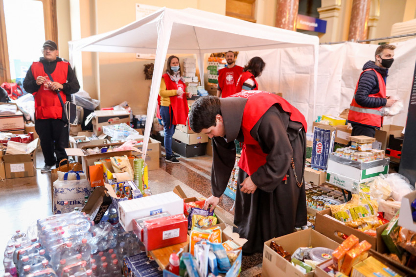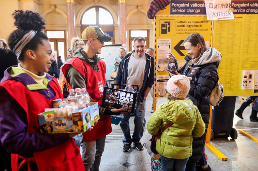 A Katolikus Karitász a háború első percétől kezdve segíti a menekülteket, önkéntesei Budapesten, a Keleti pályaudvaron csaknem két hete vannak kint, most is a Baross térre nyíló váróterem bejáratánál található a sátruk. Rengetegen vannak, menekültek, önkéntesek, segítők, adományozók, a pulton és a háttérben is konzervek, édességek, ásványvizek, tisztítószerek.