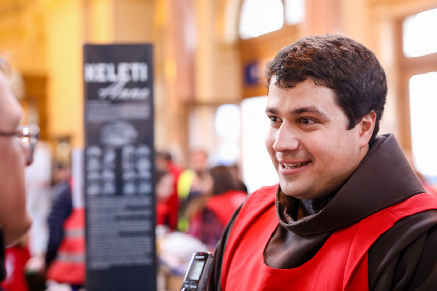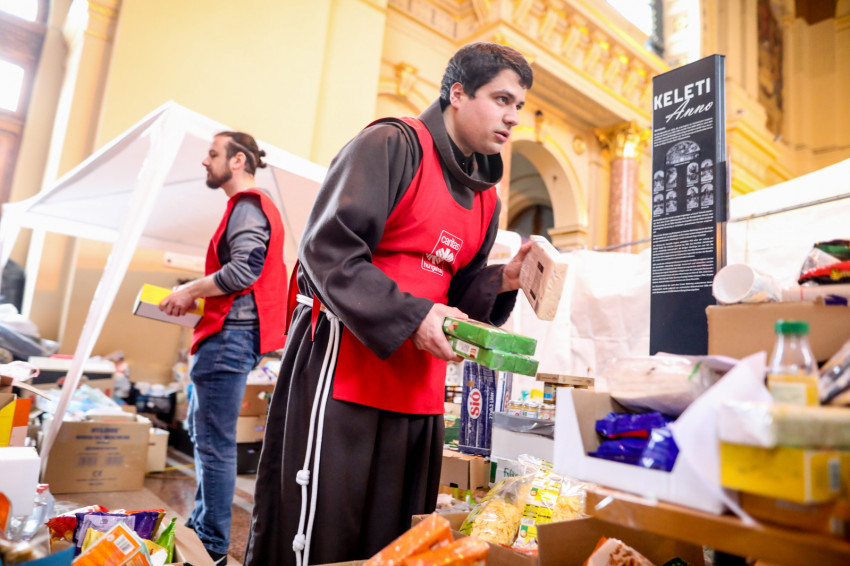 A karitász pultja mögött, a háttérben Kóta Quirin ferences növendék fantasztikus műgonddal válogatja az adományokat, teszi sorba őket, hogy minden áttekinthető legyen. Elmeséli, hogy a plébániáján, ahová tartozik, a karitász vezetői mondták, hogy van lehetőség az önkénteskedésre, és mivel a hosszú hétvége következtében nincs tanítás a Sapientián, kijött ide segíteni. Van tennivaló bőven, és ahol munka van, ott segíteni kell.