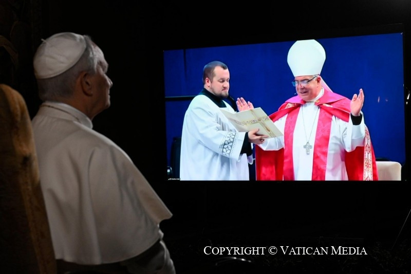 Szentatya, áldás számunkra az ön jelenléte. Itt van velem Christophe Pierre bíboros, Nelson J. Pérez érsek, itt vannak püspöktestvéreim, és Christina Lamas. Örömünkre szolgál, hogy az indianapolisi főegyházmegyében üdvözölhetjük önt az Egyesült Államokba tett első digitális látogatásán.