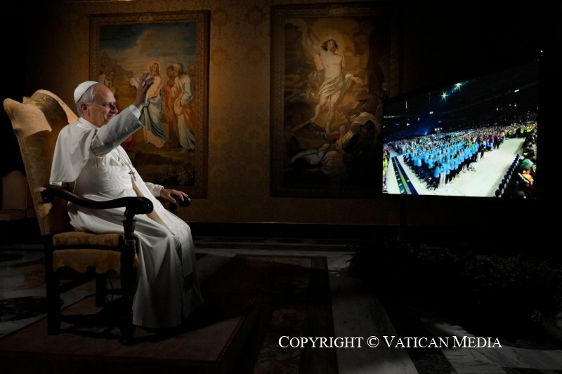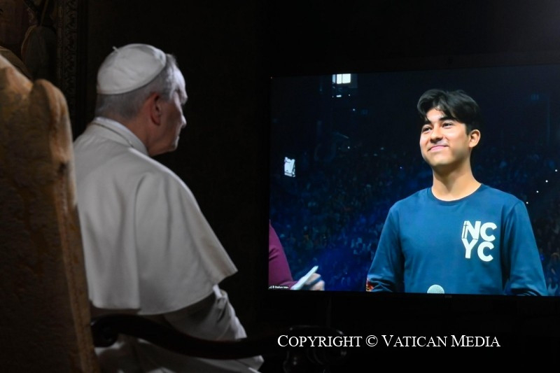 Azokhoz szólok, akik részt vesztek a konferencián Indianapolisban, tudnotok kell: imádkozom értetek. Remélem, hogy mindaz, amit ezen a konferencián átéltetek, ösztönözni fog arra, hogy még mélyebben szeressétek Jézust és az Egyházat, és hogy ezt a szeretetet hazavigyétek családotokhoz, barátaitokhoz, iskolátokba és plébániátokra. Most azokhoz szólok, akik online kapcsolódtak hozzánk: a meghívás nektek is szól. Ti is arra vagytok meghíva, hogy misszionárius tanítványok legyetek, bárhol is éltek. Az Úr mindannyiatokat arra hív, hogy osszátok meg a jó hírt: azt az örömhírt, hogy Jézus meghalt bűneinkért, feltámadt, és ma is él, szeretetét és barátságát kínálja nekünk.