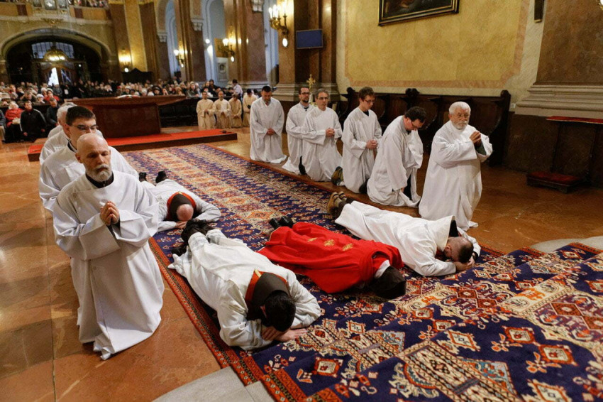 Elnémulva leborulni. Ma a papság a szent szertartások kezdetén leborul, lefekszik a földre a nyitott tabernákulum előtt. Nincs ének, nincs hangzó szó, nincs beszéd. A nyitott tabernákulum Jézus megnyitott oldala. A szent Kereszt alatt vagyunk most. Itt a Szentlélek megtanítja a bűnös ember alaphelyzetét Isten végső megjelenése, kinyilatkoztatása előtt: ez az adoráció alaphelyzete.