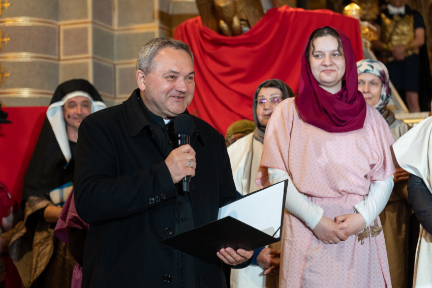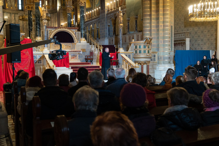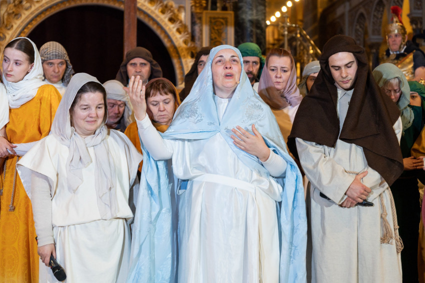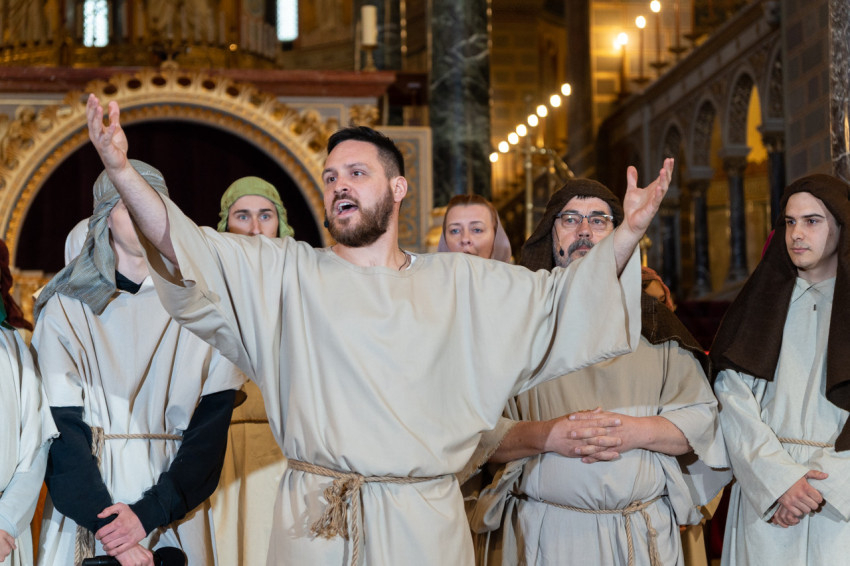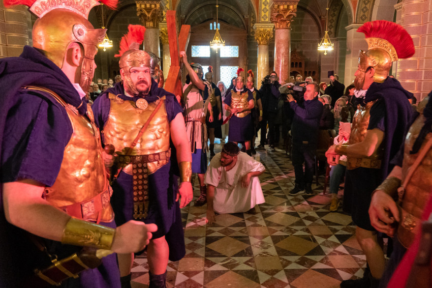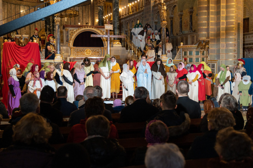 Felföldi László pécsi megyéspüspök köszöntötte a megjelenteket, köztük az egyházi és közjogi tisztségviselőket. Az érdeklődők teljesen megtöltötték a székesegyház épületét. Telt ház, a látottak okán mindvégig tapintható feszültség, megrendültség és visszatérő vastaps kísérte az előadást, melyben a Megváltó Krisztus értünk vállalt passiójának pillanatképei elevenedtek meg.