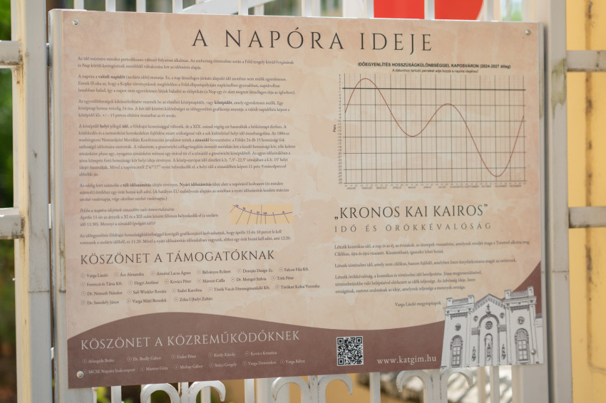 „A kivitelezésének célja volt továbbá, hogy tanórán kívüli kiegészítő anyagokat adunk vele kapcsolatban a diákoknak, foglalkozásterveket dolgoztunk ki a napóra tanításával kapcsolatban, ami a tudásbővítésen túl a tanulók kompetenciafejlesztéséhez is hozzájárul” – mondta az igazgató, majd köszönetet mondott mindazoknak, akik segítették a megvalósítást.