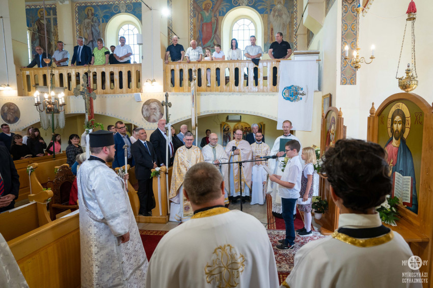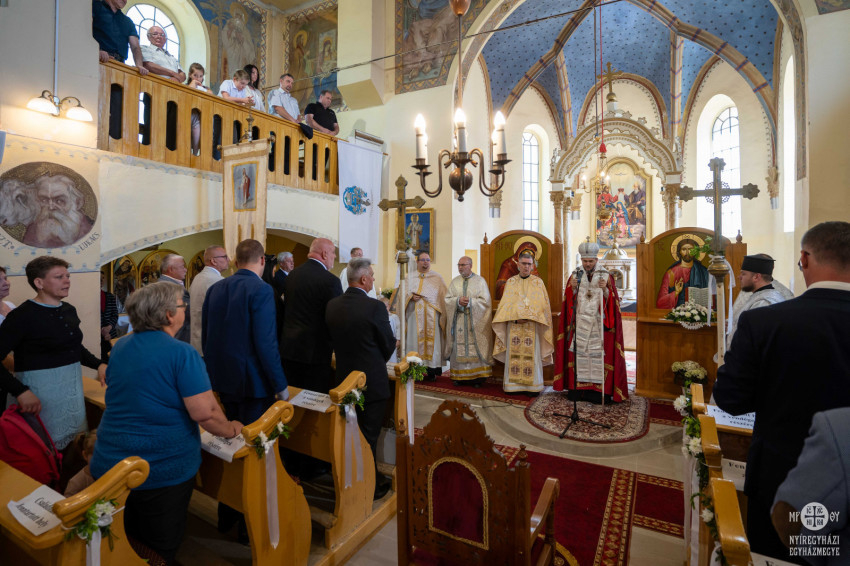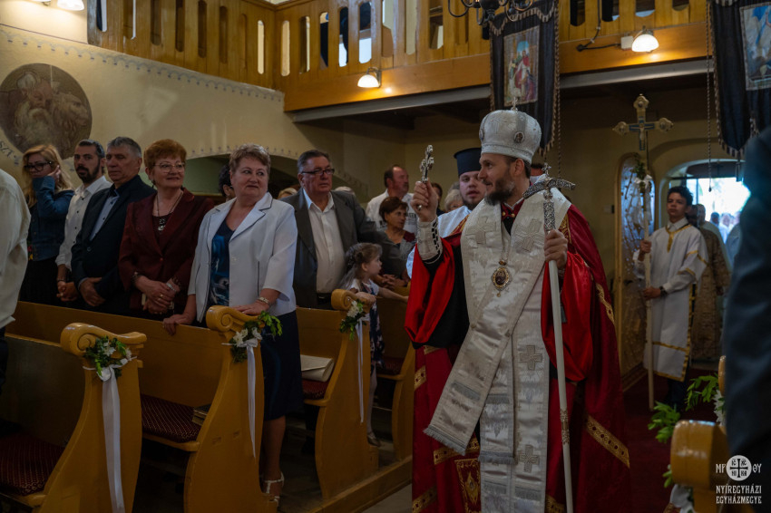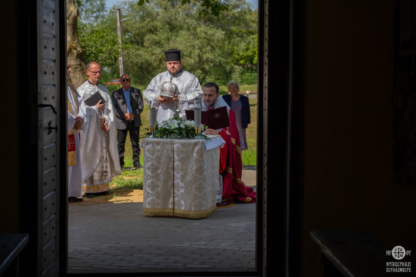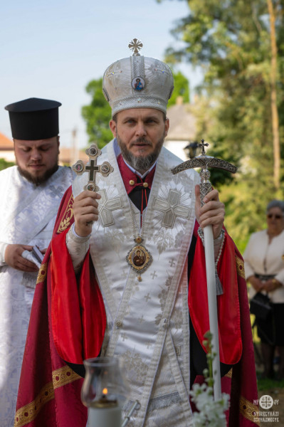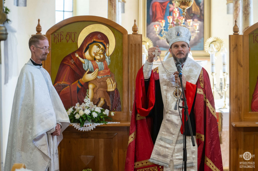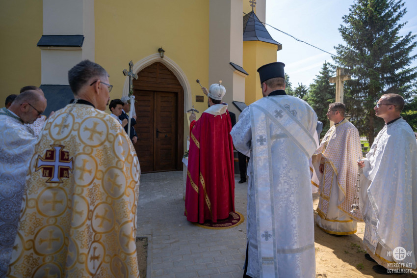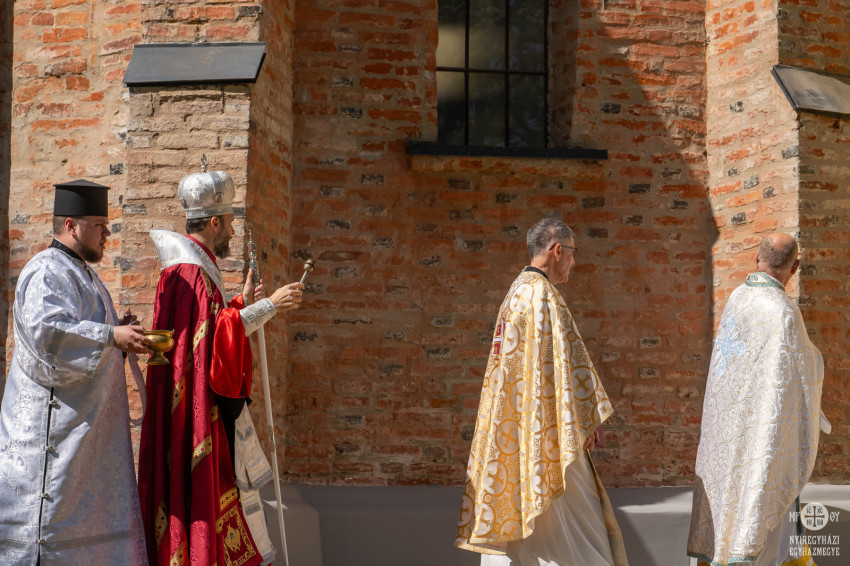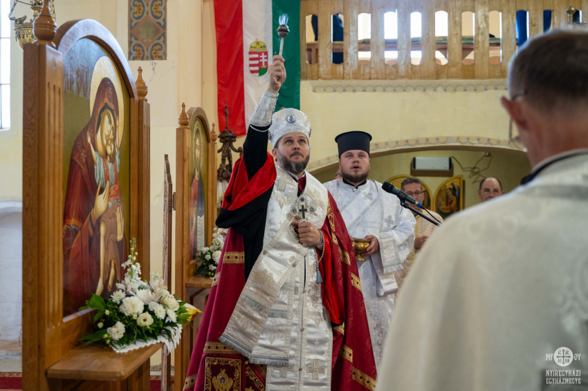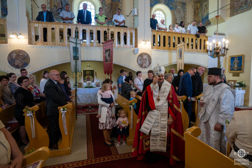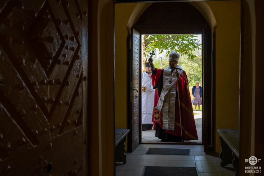 A külső falakat és az épületbelsőt, a templomhajót is meghintette szenteltvízzel Szocska Ábel püspök, majd kezdetét vette a Szent Liturgia.