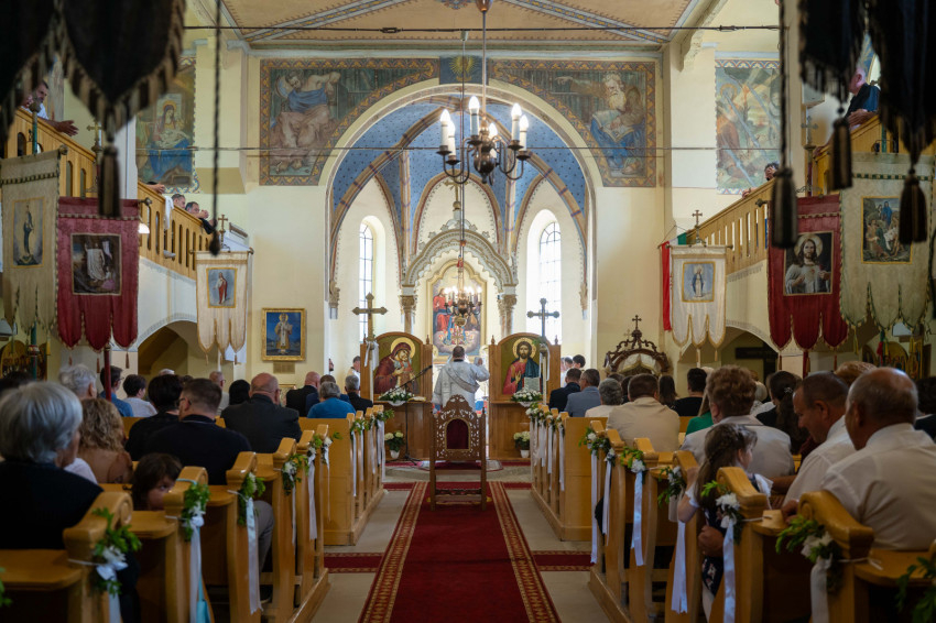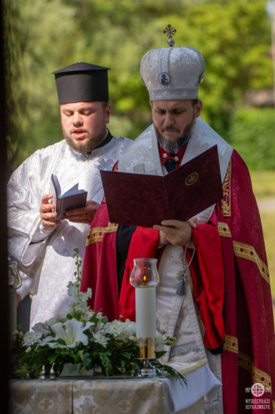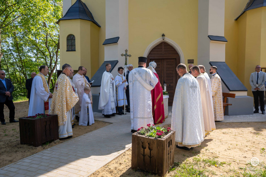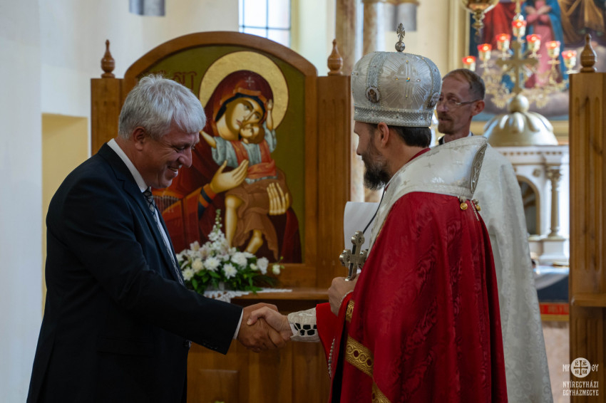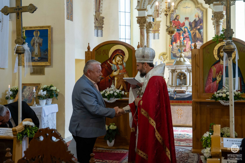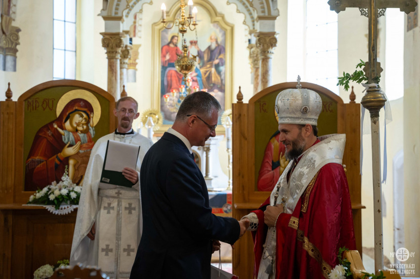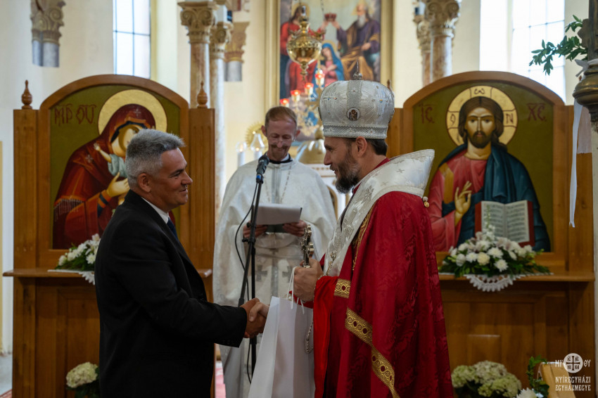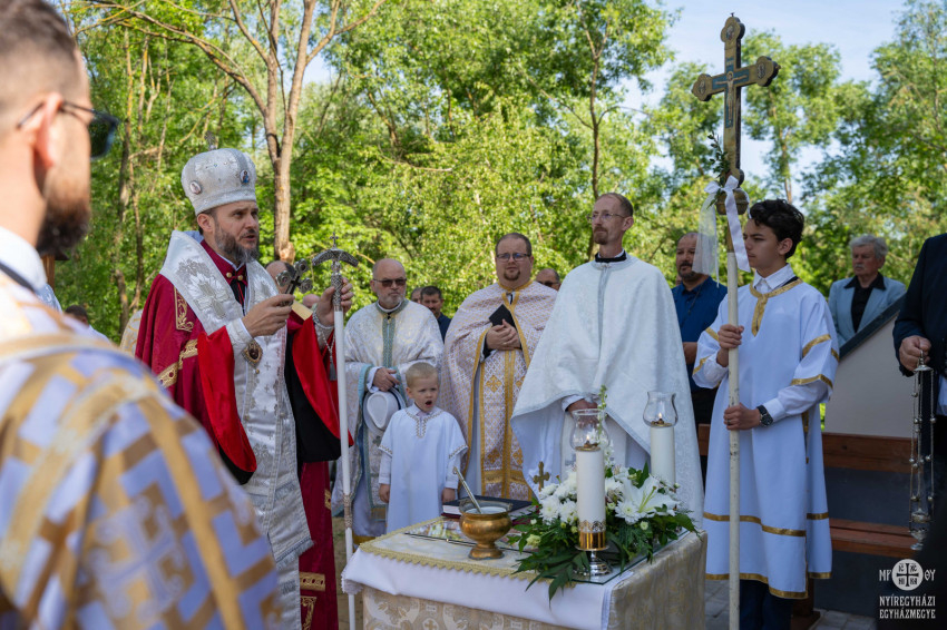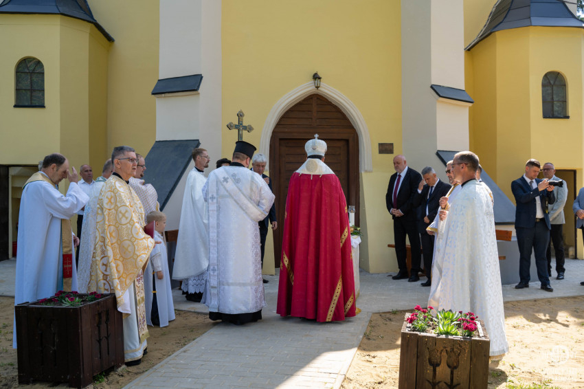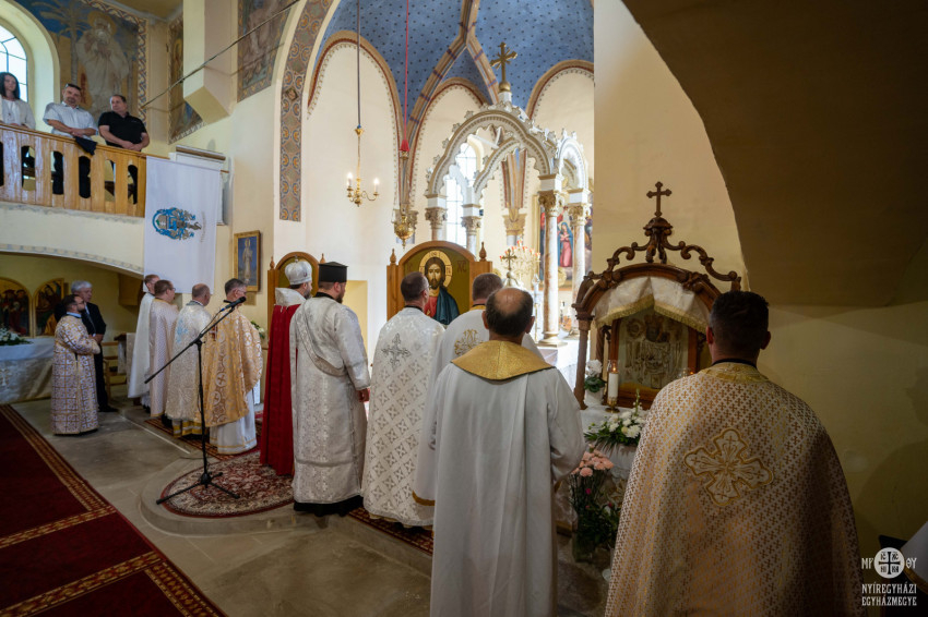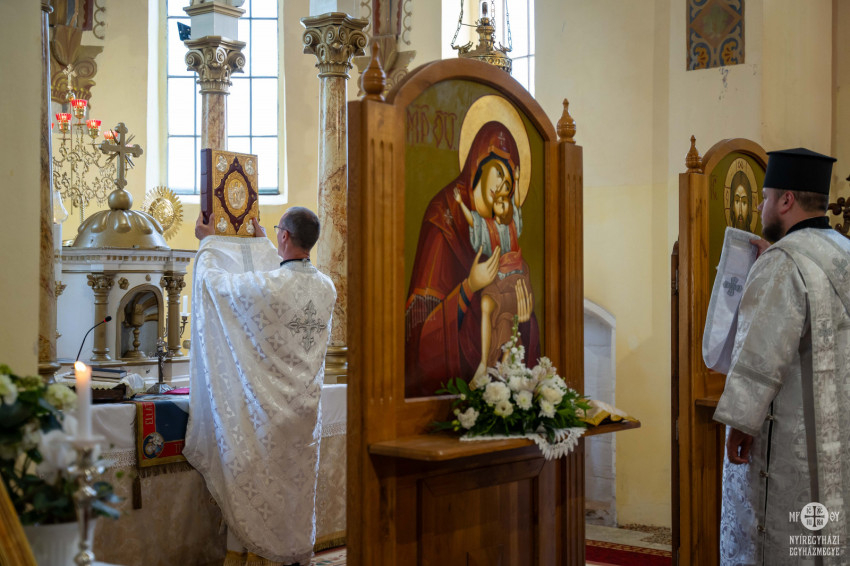 A külső falakat és az épületbelsőt, a templomhajót is meghintette szenteltvízzel Szocska Ábel püspök, majd kezdetét vette a Szent Liturgia.