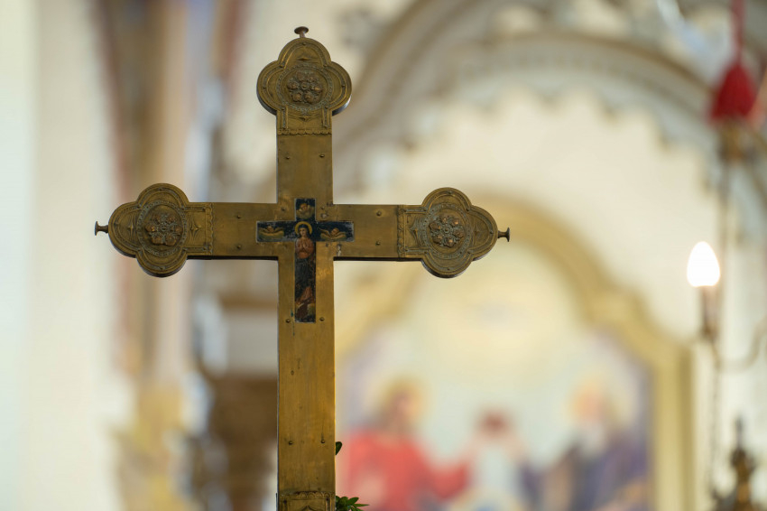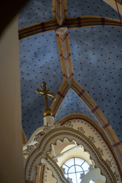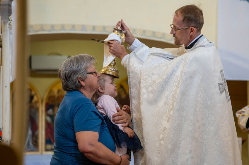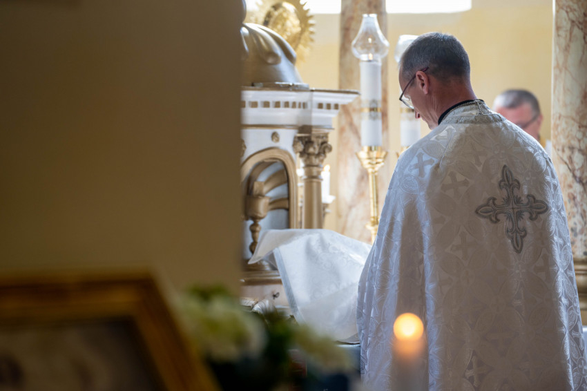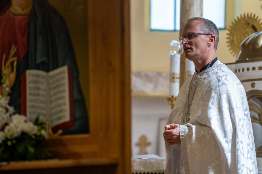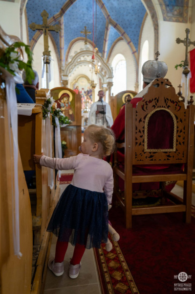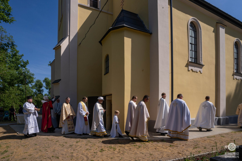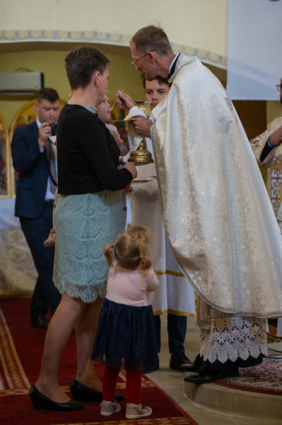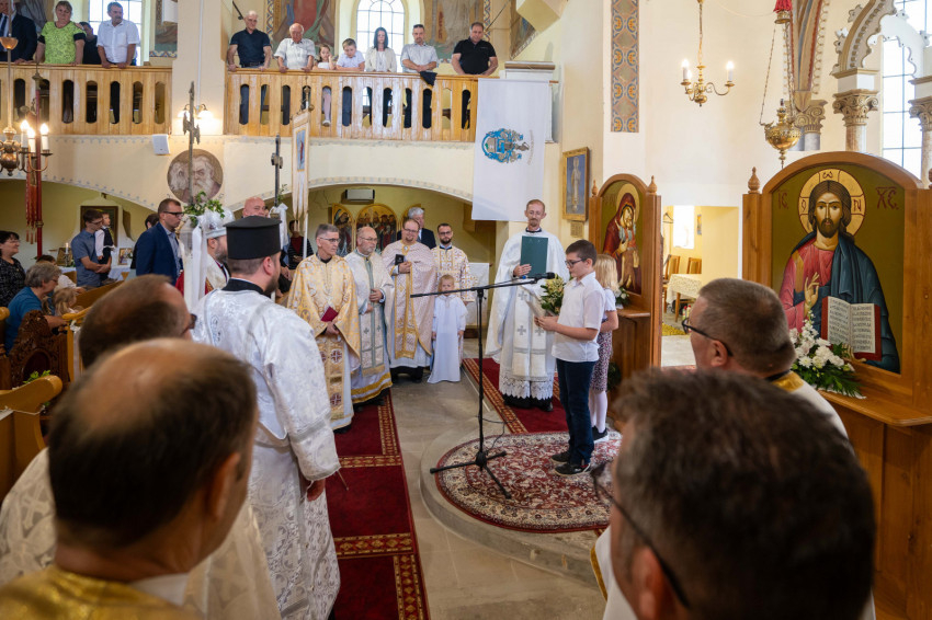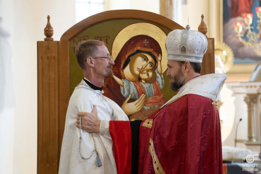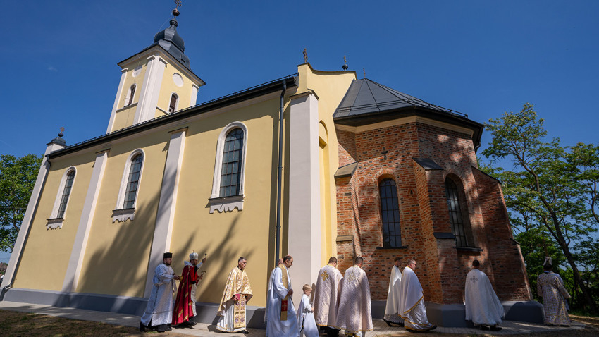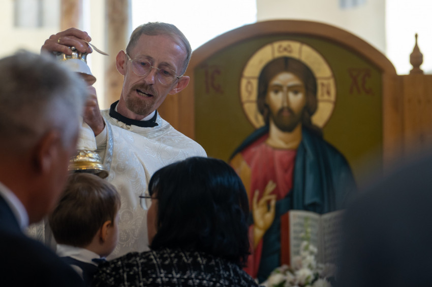A külső falakat és az épületbelsőt, a templomhajót is meghintette szenteltvízzel Szocska Ábel püspök, majd kezdetét vette a Szent Liturgia.