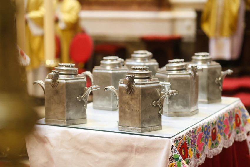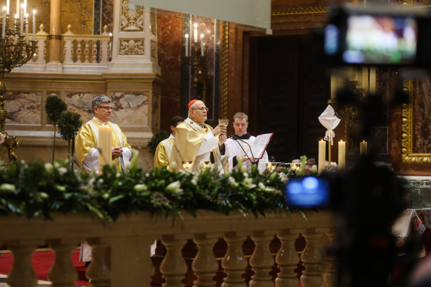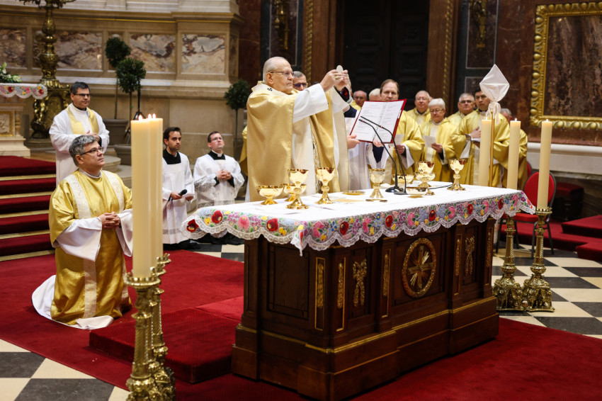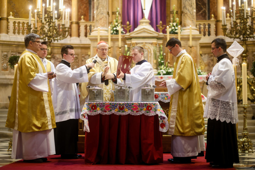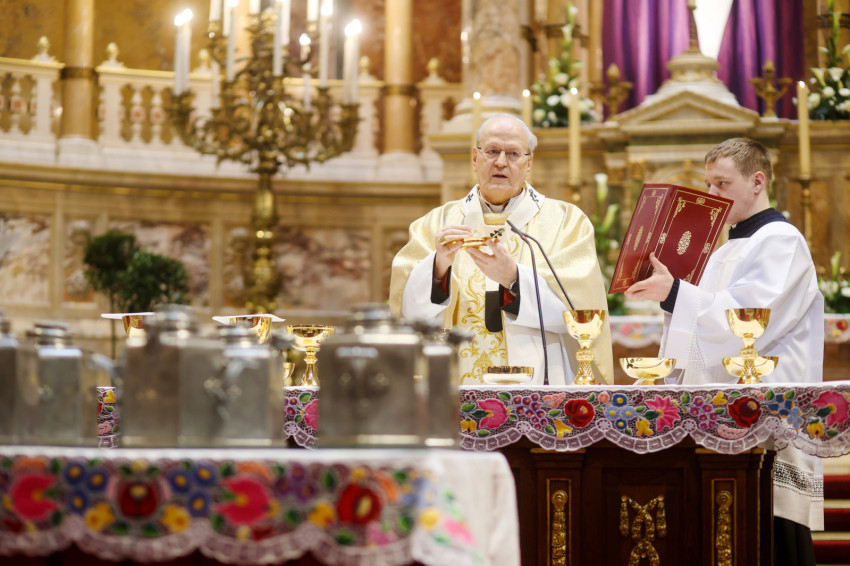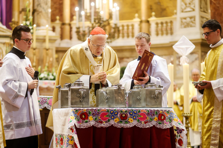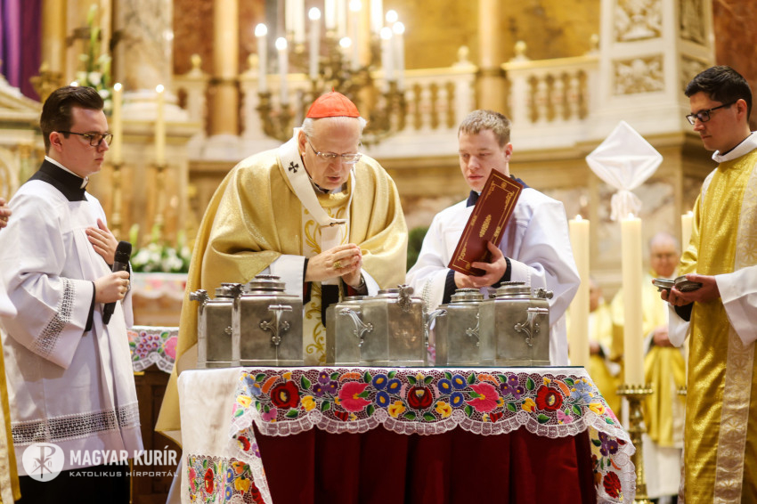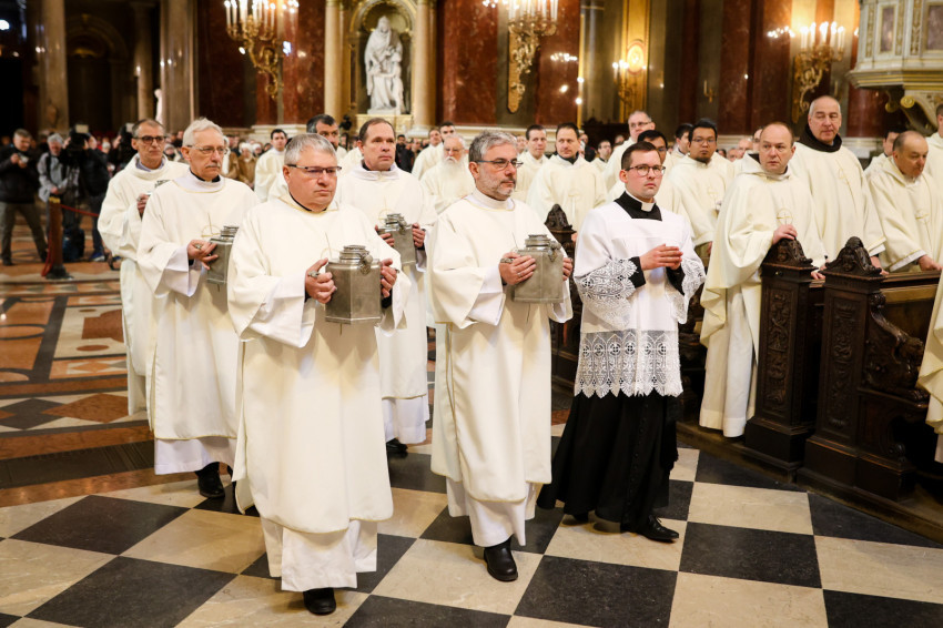 Nagycsütörtök délelőtt az olajszentelési szentmise vezeti be a szent háromnap ünneplését. Erdő Péter bíboros az Esztergom-Budapesti Főegyházmegye papságával és az egyházmegye területén szolgáló szerzetespapokkal együtt mutatta be a szentmisét, melyen koncelebráltak Michael Wallace Banach apostoli nuncius, a főegyházmegye segédpüspökei, Mohos Gábor és Martos Levente Balázs, valamint teljes papsága, illetve együtt ünnepeltek a főegyházmegye diakónusai és hívei is.
