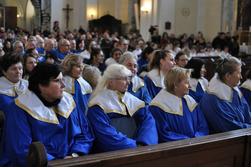 A pápai és a magyar himnusz elhangzása után újra felzúgott az Istent dicsőítő imádság és a váci székesegyház kórusainak ünnepélyes karéneke.