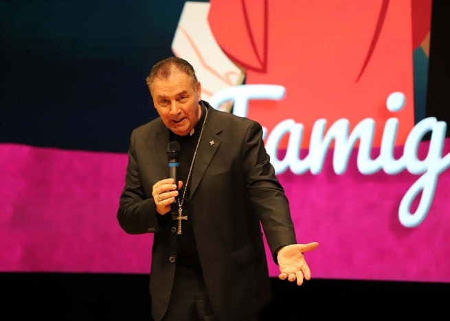 „Abban a házban vagyunk, amelyhez mindannyian tartozunk – mondta Ángel Fernández Artime bíboros, szalézi rendfőnök köszöntőjében a Don Bosco Színházban a nyitórendezvényen. – A Szűzanya üdvözöl bennünket, Isten megáld minket. Azért vagyunk itt, hogy megmutassuk az élő karizmát.”