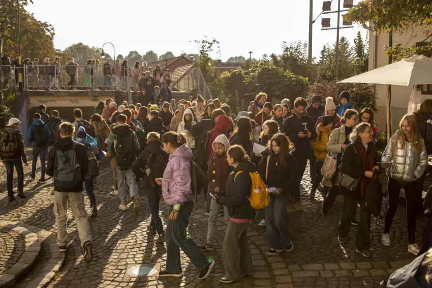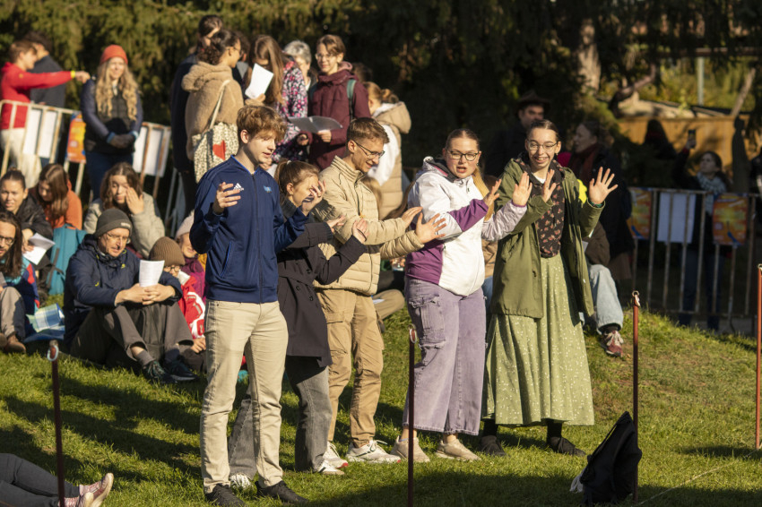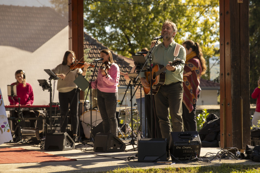 Zenés, imádságos ráhangolódással indult a nap a nagymarosi templomkertben. Csiszér László és zenekara dinamikusan kezdett az októberi napfényben aranyló, kissé hűvös reggelen, majd következett a szokásos táncos „átmozgatás” a főelőadás előtt.