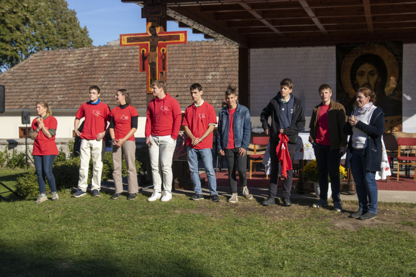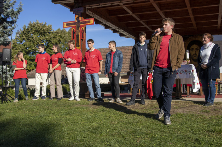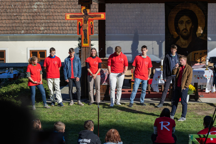 A délutáni szentmise előtt a „piros pólósok” szervező-segítő-animátori csapatának tanúságtételét hallhatták a találkozó résztvevői a nagymarosi templomkertben. Ők azok, akik többek között a találkozó táncait is vezetik.