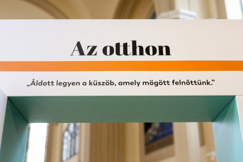 Az első felirata Az otthon. Mindszenty a bíróság előtt elmondott beszédében úgy fogalmazott, hogy a származás, a hazai környezet olyan, mint a vaspálya, ami visz és sok mindent megmagyaráz, sziklaszilárd alap, de sok mindenben gátol is. Ez tulajdonképpen egy önkritikus megjegyzés, hiszen az értékek mellett a korlátozottságokra is rámutat. Ezen a kapun, amely egyébként nem véletlenül áll egy kicsit oldalra fordítva, mindenkinek át kell lépnie. Mindszenty szülői házából szinte semmi sem maradt meg az eredeti állapotában, de a pajta igen, az itt látható deszkaajtó tehát eredeti. „A hátoldalán látható Mindszenty József egyetlen gyerekkori fényképe, melyet úgy helyeztünk el, hogy mellé állva akár szelfizehetünk is a kis Józsikával” – mutat az életnagyságú képre Kovács Gergely. Ide került az érettségi tablóképe is. Érdekes, hogy mint írja, hetvennyolcan indultak, és csak tizenketten érettségiztek le.