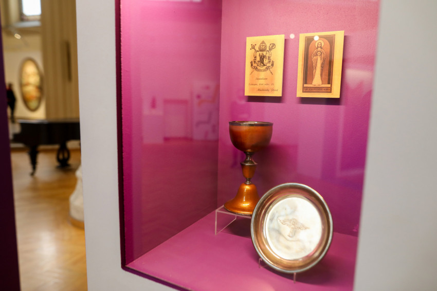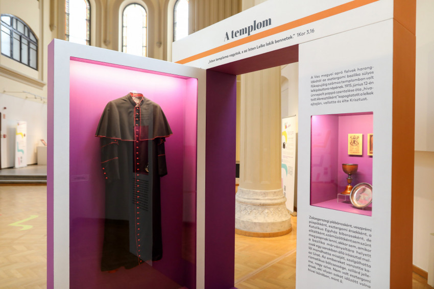 Az itt bemutatott szerény bíborosi ruha azt fejezi ki, hogy hercegprímásként is megmaradt egyszerű papnak. Ez a talár Krisztus egybeszőtt köntösére is utal. A kelyhei közül azt állítottuk ki, amely eredetileg az aranymisés VI. Pál pápa kelyhe volt. Mindszenty ezt 1971-ben kapta az egyházfőtől. Emellé került a Szentlelket ábrázoló paténa és püspökké szentelésének emléklapja is. A kapu oldalán ezt olvassuk: „Akarok Jó Pásztor lenni, aki, ha kell, életét adja juhaiért.” Itt láthatjuk a Boldogasszony évének (1947. augusztus 15. – 1948. december 8.) egyik logóját is.
