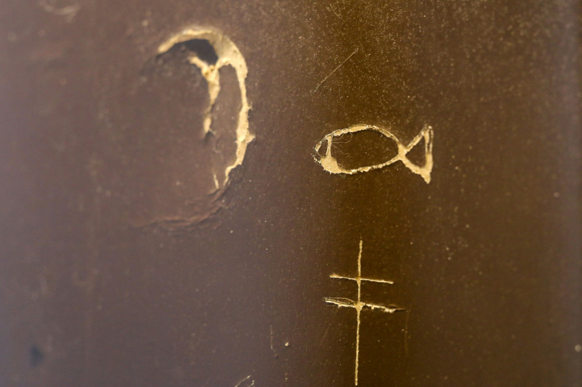 Az itt látható feszület szinte biztos, hogy életének korai időszakából való, ezért is került Az édesanya című könyve mellé. A fehér és az okkersárga a hátul látható Szentlélek-üvegablakot idézi meg.