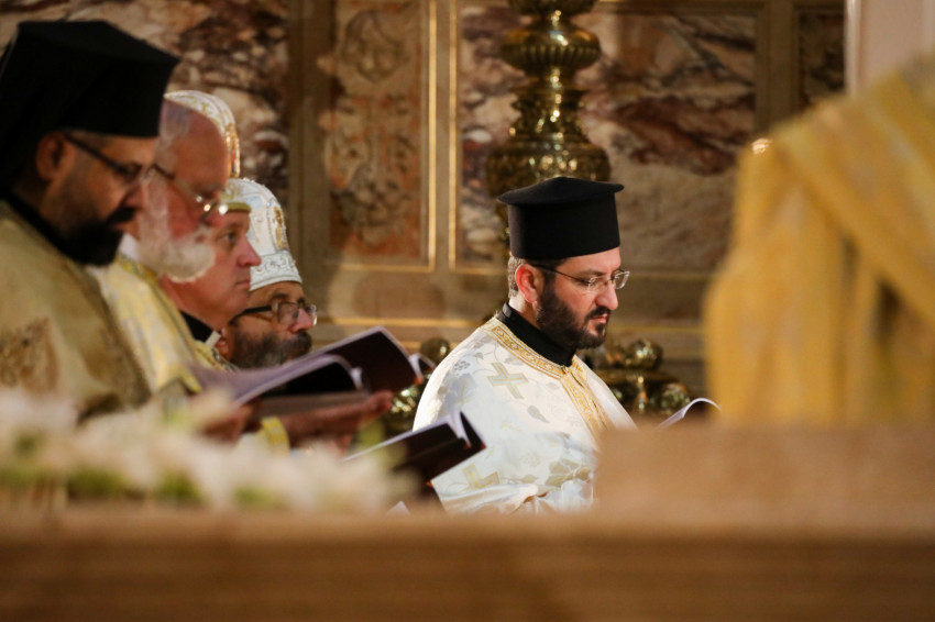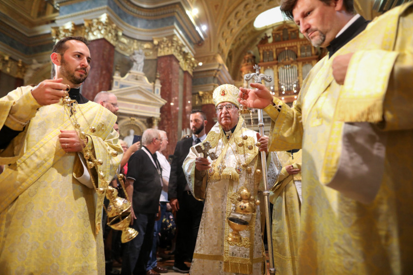 A házigazda Erdő Péter bíboros olasz és magyar nyelven köszöntötte az Esztergom-Budapesti Főegyházmegye társszékesegyházában a jelenlévőket: Őboldogsága I. József (Youssef Absi) melkita pátriárkát, a Szent Liturgia főcelebránsát, a nagyérsekeket, metropolitákat és püspököket, a paptestvéreket és minden hívőt, „akik látható módon is tükrözik Katolikus Egyházunk sokszínűségét és hagyományának gazdagságát”. „Ez a templom Szent István király nevét viseli, itt őrizzük leghíresebb ereklyéjét.