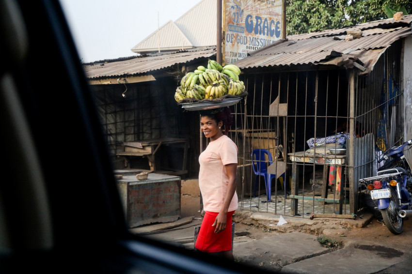 Awka-Etiti alig harminc kilométernyire, autóval szerencsés esetben egy órányira van Onitshától. Szerencsétlen esetben ez állítólag négy-öt óra is lehet. A göröngyös utakon hol jobbról, hogy balról jönnek szembe a jellegzetes, sárga motoros riksák, csordultig pakolt furgonok, motorok, autók; az út mentén árusok, kis asztalkáikon avokádóval, kókusszal, jamgyökérrel, magvakkal, banánnal és még megszámlálhatatlan gyümölccsel, közben egy-egy üzlet, ahol óriási Mária- és Jézus-szobrokat vagy számunkra felismerhetetlen alakokat árulnak, ruhák, cipők, csetreszek között óriás kovácsoltvas, és ki tudja, miből összetákolt kapukat kínálnak… Jó lenne kiszállni és belekavarodni a forgatagba, de nem szabad, vigyáznak ránk.