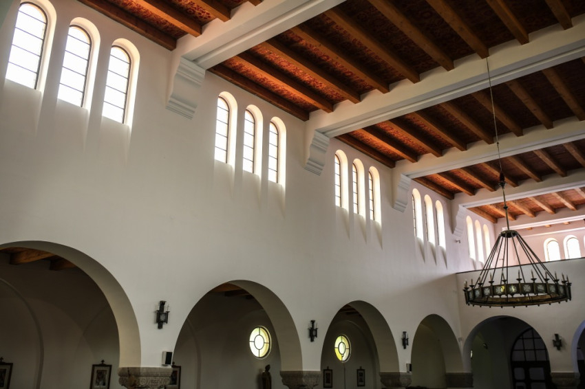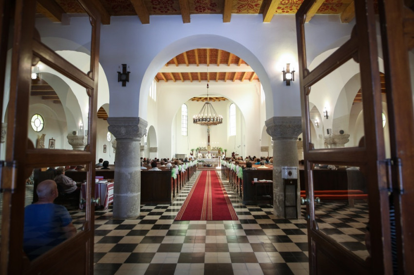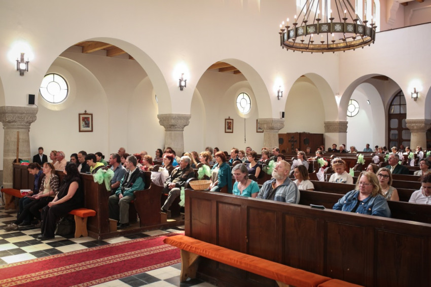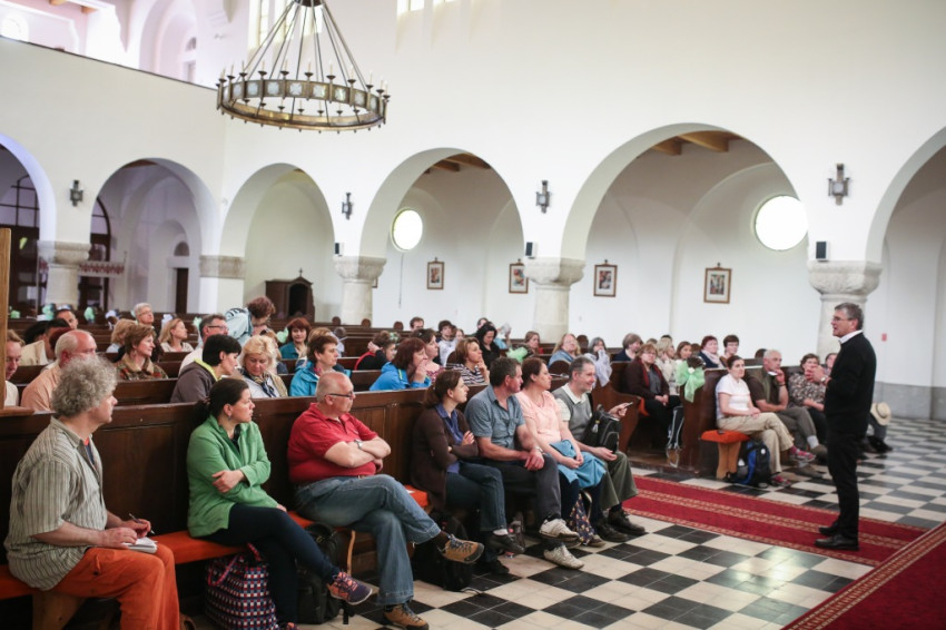 Ebéd után Sümegi József állandó diakónus a feldíszített templomban – nemsokára esküvő lesz itt – a kegyhely történetéről beszél. Jelentős szerepéről a magyar történelemben és a bencés rend történetében, mivel valaha nagyobb bencés központ volt, mint Pannonhalma. Szent László alapította 1093-ban, és a 14. században történt eucharisztikus csoda révén nemzeti zarándokhellyé vált, amelyet királyok is felkerestek; egyszer, három hétre Mátyás is. Ám 1539-ben a törökök feldúlták, ezután lassan feledésbe merült, és csak közel négyszáz évvel később, 1938-ban, az eucharisztikus világkongresszusra, nemzeti összefogással „támadt fel”, épült újjá. Kazettás, sárközi motívumokkal díszített mennyezete, fehér falai egészen különlegessé, puritán jellegűvé teszik.
