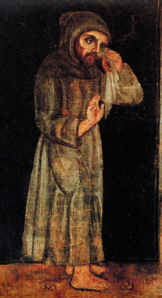 És még egy szót Ferencről, hogy jó szemmel, azaz pontosan nézzük a szemeit. Mert a szép szimmetrikus arcon a festő mintha megfeledkezett volna a szemek azonosságáról és éppen a jobb szemet lényegesen kisebbnek ábrázolta és közelebb helyezte a szemöldökhöz. Tudjuk, hogy amikor Szent Ferenc 1219-ben az egyiptomi Damiettába utazott és találkozott Malik al Kamil szultánnal, útközben a szeme megfertőződött és zöldhályog (glaukoma) hatalmasodott el rajta. A hagyomány szerint éppen Ugolino bíboros szorgalmazta a szemműtétet, mert Ferenc látása nagyon gyorsan romlott és ezért a Rieti melletti Fontecolombóba (galambos forrás) utazott. Erről már a Fioretti is ír: „Egy időben Szent Ferencnek nagyon fájtak a szemei, s Hugolin kardinális, a Rend védője, mivel gyengéden szerette őt, írt néki, hogy jöjjön hozzája Riétibe, hol akkor kitűnő szemorvosok voltak… Szent Ferenc szembaja a következő éjjel annyira rosszabbodott, hogy már a világosságot sem látta…”, így aztán nem kevés megfontolás után végül „elindult Rietibe”. A hely egyébként nagyon kedves volt a szentnek, mert 1223-ban itt írta meg a kisebb testvérek Reguláját (Regula bullata). A közeli Greccióban, ahol korábban „élőben” megidézte Betlehemet, egy ikon úgy mutatja, amint kendővel törli a szemét. Már nem lát jól, de annál inkább érzi az Utat és kedves Leo testvére karjára támaszkodva fölmegy La Verna hegyére, és ott az egész testére megkapja Krisztus megváltói szenvedésének jeleit. Aztán lejön a hegyről és nem sokkal később, érett óráján, kéri, fektessék le őt a humuszra „cum tucte le humilitate”, majd angyal jön érte és átkíséri ada, ahová örökké vágyott.