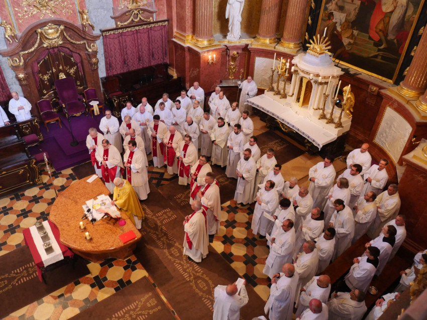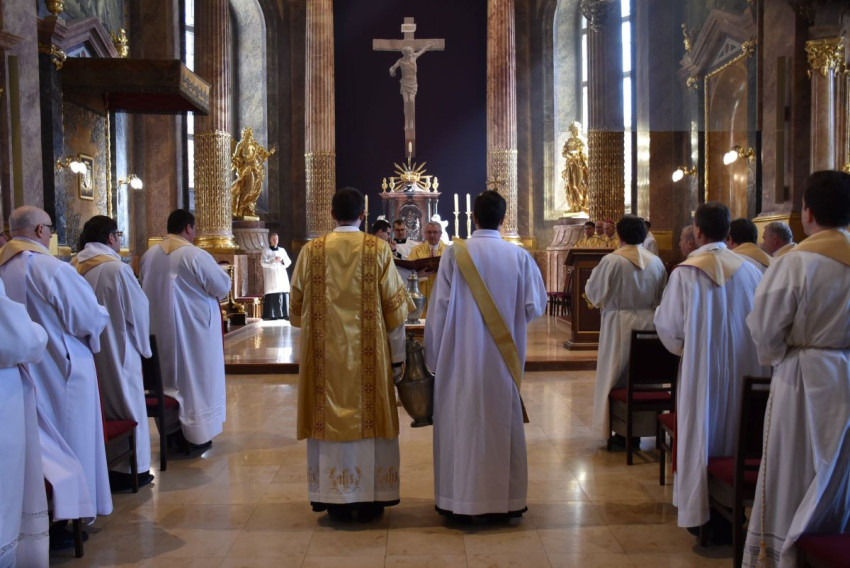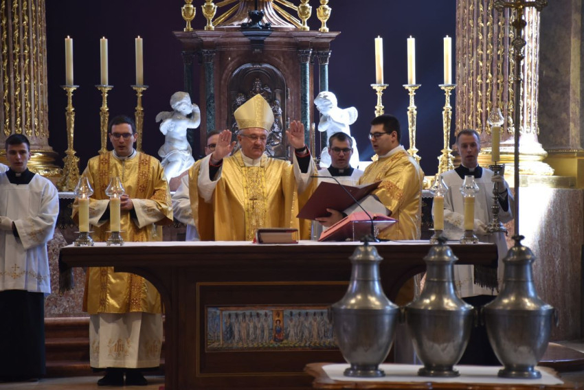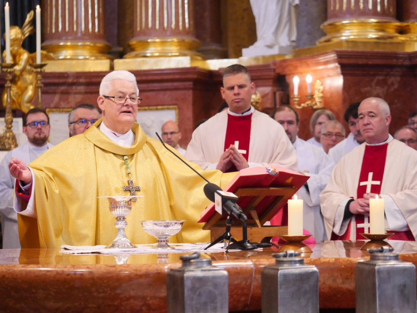 Udvardy György érsek a főegyházmegye papságával együtt mutatott be koncelebrált krizmaszentelési szentmisét április 6-án a veszprémi Szent Mihály-főszékesegyházban, amely a 2020-ban indult felújítási munkálatok óta először nyitotta meg kapuit liturgikus esemény előtt. A főpásztor megáldotta a megújult templombelsőt, az új oltárt, s a hagyomány szerint a papság is megújította fogadalmát.