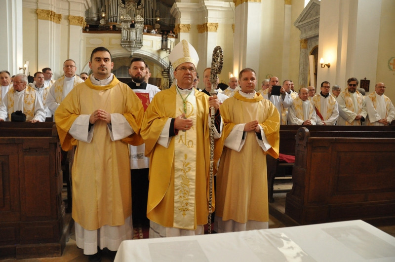 „Tele van hálával a szívem. Hálás vagyok minden paptestvéremért. Hálás vagyok, hogy kiválasztott, meghívott, felszentelt és megszentel benneteket az Isten! – kezdte prédikációját a főpásztor. – Hálás vagyok azért, hogy ezt én is szolgálhatom és segíthetem. Minél tovább vagyok püspök, annál izgalmasabb, mert annál több személyes találkozásom van veletek, annál többször élem meg a bizalmat, s tudom közvetíteni azt felétek. Ez az egyik legfontosabb megtartó erő köztetek és köztünk. Személy szerint hálát adok mindegyikőtökért ezen a szentmisén… Hálát adok a Jóistennek, hogy együtt szolgálhatjuk Isten országának ügyét, együtt végezhetjük a missziót ebben az egyházmegyében. Örülök nektek!
