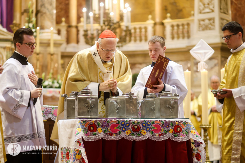 A homília után a papság Egyháznak tett ígéreteinek megújítása következett, majd a főpásztor megáldotta a főszékesegyház új oltárát. Az Eucharisztia liturgiáját a krizmaszentelés szertartása követte. A szentmise végén az érsek Lékai László bíboros, a főegyházmegye egykori papja, majd főpásztora szavaival búcsúzott, amelyeket minden nagycsütörtökön elmondott a liturgia után a sekrestyében papjainak: „Adjátok a Szentet a szenteknek szentül.”