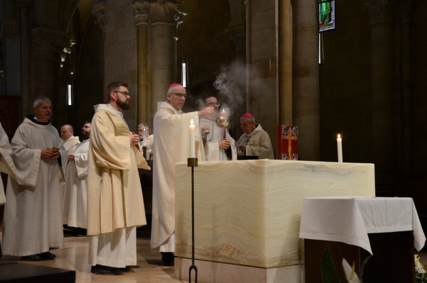 Nagycsütörtök délelőtt olajszentelési szentmisét celebrált Felföldi László pécsi megyéspüspök Mayer Mihály nyugalmazott megyéspüspökkel, Bíró László nyugalmazott tábori püspökkel és az egyházmegye papságával Pécsen, a Szent Péter- és Szent Pál-székesegyházban.