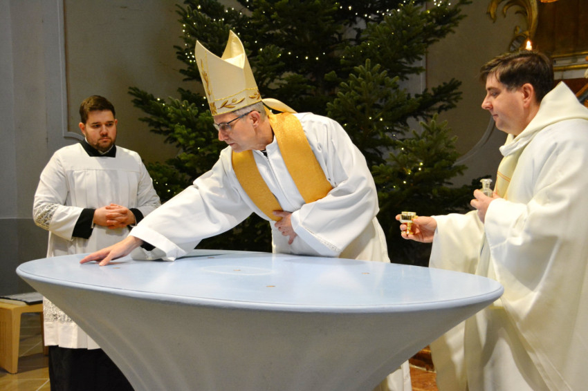 Az oltárszentelési szertartás a szentbeszéd után következett, amely során a 2013-ban boldoggá avatott Sándor István szalézi testvér, vértanú csontereklyéjét – akinek az arcképe a templom szentélyének oldalán levő üvegablakon van megjelenítve –, behelyezték az új oltárba. Miután a püspök a szent krizmával és az olajjal megkente, tömjént szórt az oltárra helyezett parázsra és imádkozott. Az oltárt ezek után leterítették és feldíszítették, majd a szentmise a szokásos módon folytatódott.