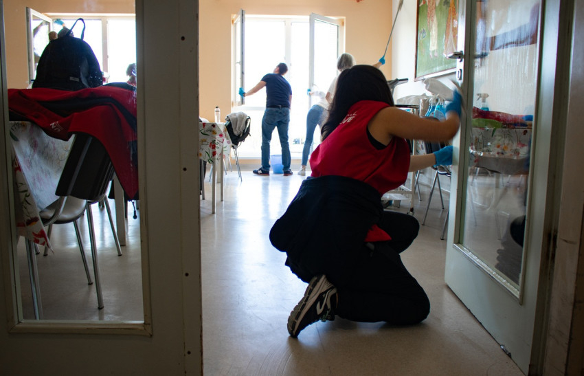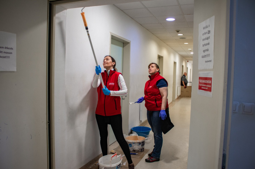 A rövid eligazítás után csoportokra oszlottak a biztosító munkatársai, az intézmény dolgozóinak vezetésével – akik mindvégig ott voltak mellettük, készségesen segítettek – lelkesen vágtak bele a munkákba. A belső és külső udvaron kertet rendeztek, emellett ablakot pucoltak, falat festettek a folyosó egy részén, két lakószobában és a teakonyhában. Kedvesen megnyugtatták az egyik lakót, aki aggódott, vajon letakarják-e majd a tévét is a szobájában, amikor majd fölötte festenek.