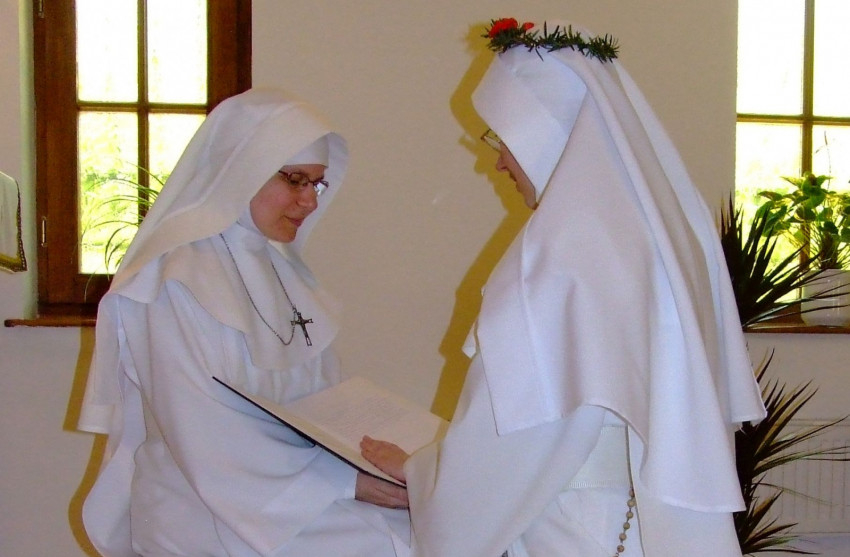 A szertartást Puskás Antal pálos tartományfőnök vezette. A jelen levő nővérek testvéri közösségében, a szentmise keretében először egy imádságos, az elöljáró által vezetett párbeszédben mondott határozott igent M. Franciska nővér a közösség küldetésére. E küldetés a szentségre törekvésre, rejtett engesztelő életre és – kiemelve a magyar nemzetért és egyházért való imádkozást – az Oltáriszentség előtt való imádó, közbenjáró imára hív.