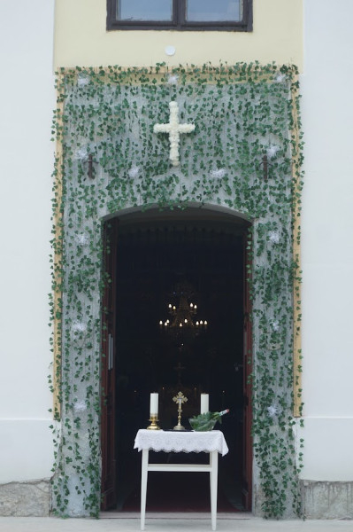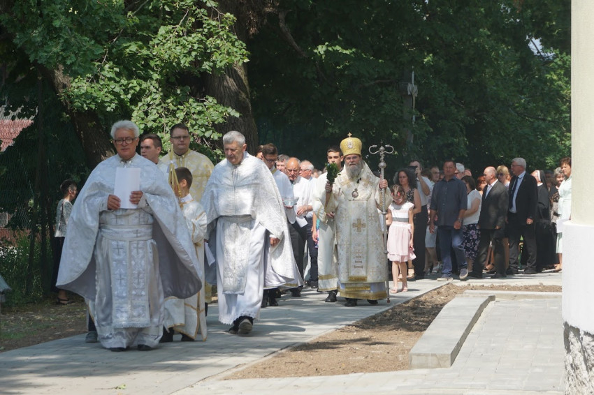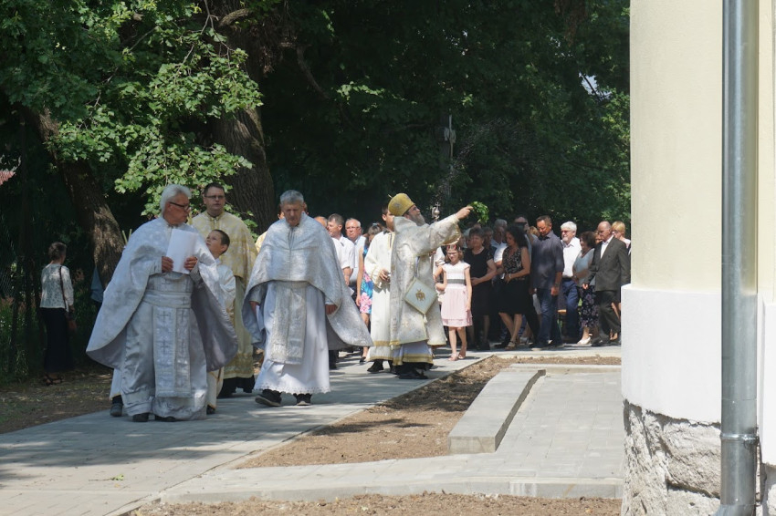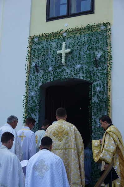 Az ünnepi szertartás a templom főbejáratánál kezdődött. A zárt templomajtó előtt mondott imádságok után Orosz Atanáz püspök körmenetben szenteltvízzel hintette meg a templom külső falait.