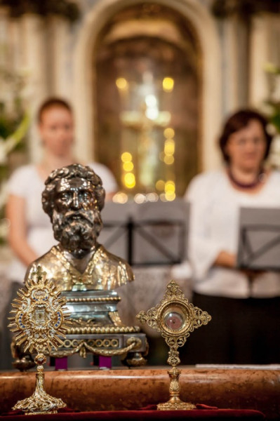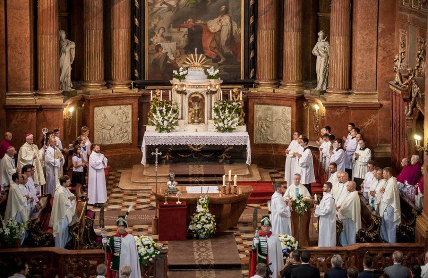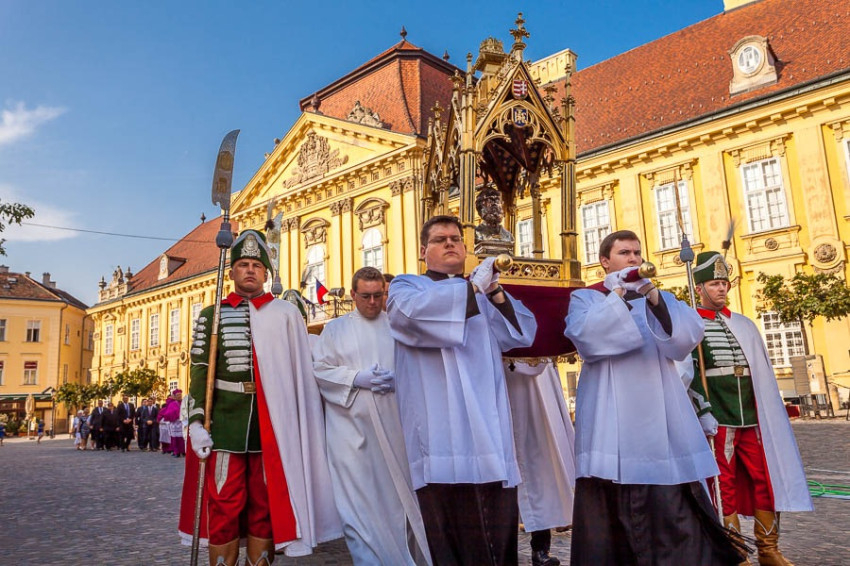 A körmenet után a Szent István-bazilikában ünnepélyesen elhelyezett magyar szent család ereklyéi előtt imádkozott a megyéspüspök az ünneplő közösséggel. Hálát adott azért, hogy első királyunk a keresztény hit útjára vezette népét. Mint államférfi, hadvezér, és mint családapa ezer év után is példa maradt az egész magyarságnak. A püspök hálát adott azért is, hogy Szent István halála előtt Szűz Mária oltalmába ajánlotta országunkat. Ezért maradhatott meg nemzetünk a történelem pusztító, viharos eseményei között.