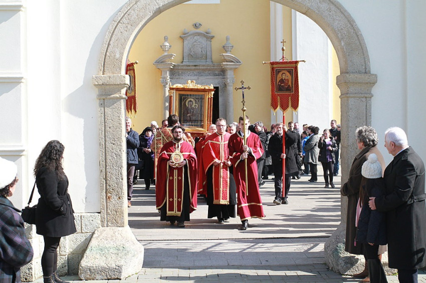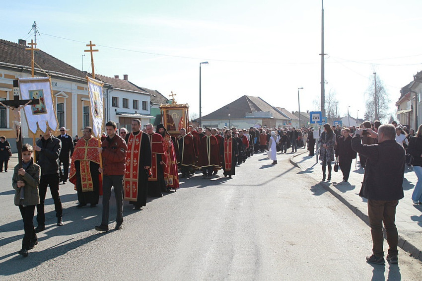 A köszöntőket követően a kegyképet gyalogosan kísérték át a Makovecz Imre tervei alapján 2000-ben épült ,,angyalszárnyas” templomba, ahol Kocsis Fülöp hajdúdorogi megyéspüspök üdvözölte az egybegyűlteket, majd megkezdődött a paraklisz (könyörgő ájtatosság az Istenszülő Szűz Máriához. A görög παράκλησις ’odahívás, segítségül hívás, kérés; buzdítás, felszólítás; vigasztalás’ szóból – A szerk.). Ezután következett a rozsályi és csegöldi egyházközség, majd az Orfeusz Egyesület és a Támasz-Pont műsora. A nap római katolikus szentmisével folytatódott, melyet Schönberger Jenő szatmári megyéspüspök celebrált. Ezt Nagy Szent Bazil Liturgiája, majd a vecsernye követte.