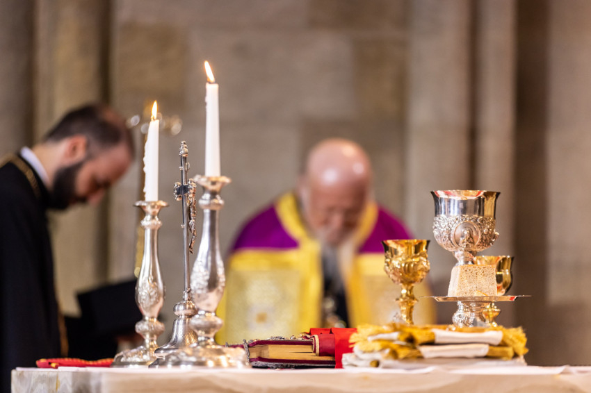 A liturgia előkészületében a pátriárkára feladták a mandiászt, azt a palástot, amelyet akkor visel, amikor nem áll az oltárnál, nem végzi az Isteni Liturgiát, hanem oldalt áll a trónusszékében, és prezideálja, elnökli a szertartást.