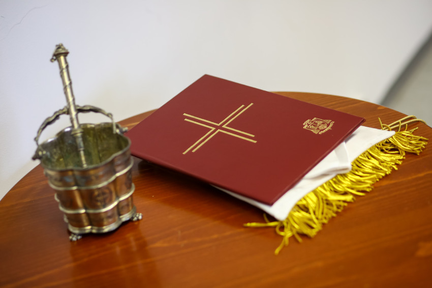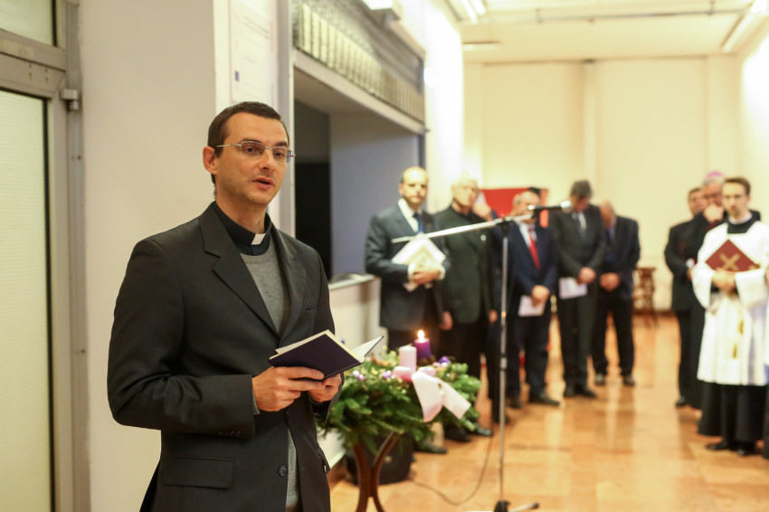 Kozma Gábor, a PPKE BTK lelkiségi ügyekért felelős dékánhelyettese köszöntötte a megjelenteket, köztük az egyetemek vezetőit, képviselőit és Tóth Tamást, az MKPK titkárát a Műegyetem épületében kijelölt új otthonuk házszentelésén, a Pázmány-egyetem legújabb kori létesítésének 30. évfordulóján.