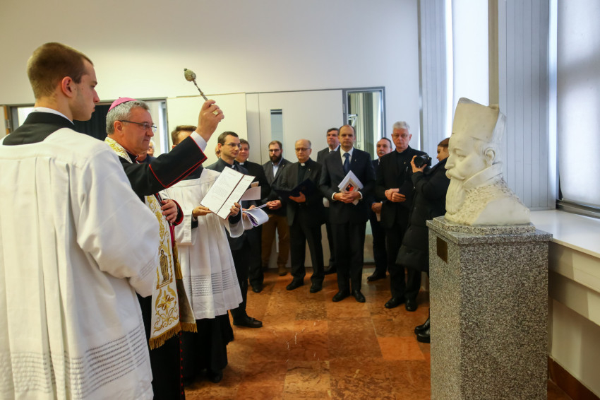 A Pázmány Péternek tulajdonított énekszöveget énekelve vonultak át az ünneplők az alapító mellszobra elé, amelyet Veres András megáldott. Majd az Ó jöjj, ó jöjj kezdetű ének hangzott el, miközben az aulába tartottak, ahol a püspök megáldotta az adventi koszorút, és meggyújtotta rajta az első gyertyát, végül megáldotta az épületet, a benne tanítókat és tanulókat.