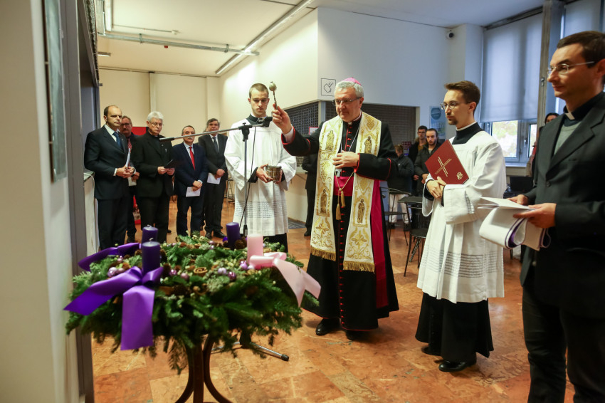 Veres András püspök beszédében elmondta, ezt az eseményt ugyan tarthatták volna a tanév elején, de az advent elején is ugyanolyan létjogosultsága van. Mostanra már mindenki megismerhette ezt a házat, ezáltal is lehetőség nyílik arra, hogy jobban meg tudjunk nyílni egymás felé. Az advent segít jobban figyelni a lelkiekre és egymásra, jobban felkészülni az Istennel való talákozásra. „Akik Istennel már találkoztunk, és szeretnénk vele mélyebb közösségre jutni, tudjuk, hogy ez a kapcsolat is időt igényel. Rengeteg felületes találkozásban van részünk nap mint nap, amiben nem tud kialakulni a személyek közötti találkozás, és ez Istennel kapcsolatban is így van” – mutatott rá a főpásztor.