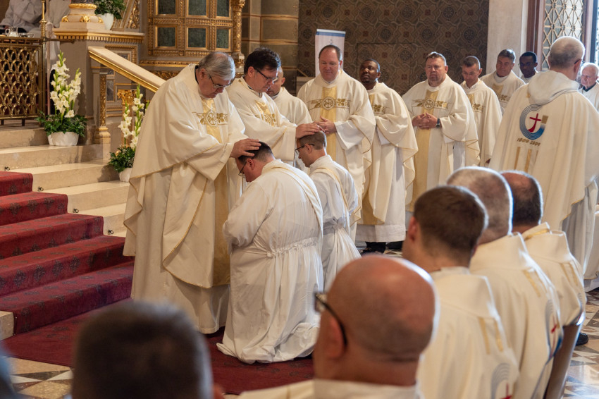A püspök fölszentelő kézrátételét követte a jelen lévő papok kézrátétele a jelöltek fejére annak jeleként, hogy az idősebb testvérek befogadták az új papokat az egyházmegye papi közösségébe.