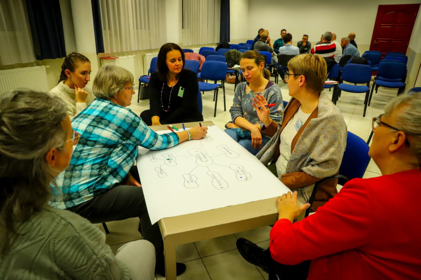 Majd a társaság csoportokra osztva úgynevezett gondolattérképet (vizuális kommunikációs technika, amely az emberi gondolkodás sajátosságaihoz illeszkedve hatékonyabb feldolgozást, tanulást tesz lehetővé, mint a hagyományos módszerek – a szerk.) készített, a „Mitől lesz vonzó a plébánia, mitől érezzük otthon magunkat benne?” témában.