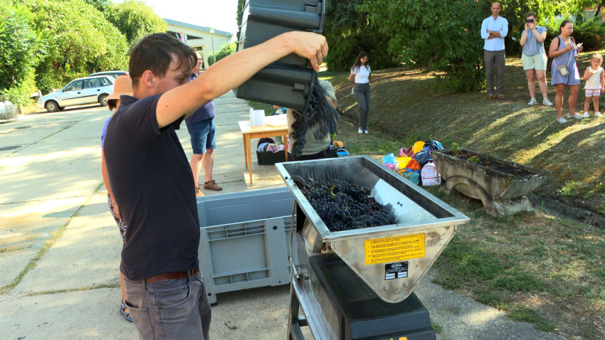 A munka nagy része véget ért a szőlőszedéssel, a gyerekek ezután megismerhették, hogyan történik a feldolgozás. Előbb azonban jött a jól megérdemelt zsíroskenyér.