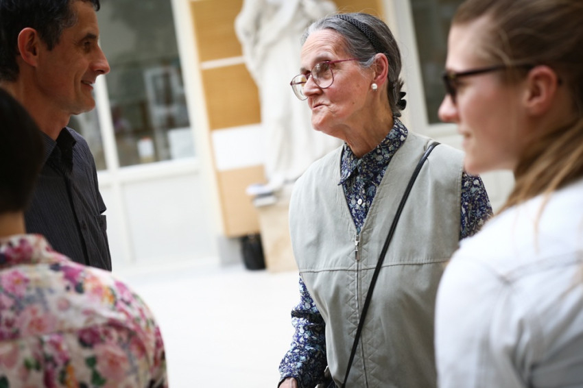 Ozsvári Csaba életének bemutatása után rögtönzött tárlatvezetésre került sor a főiskola aulájában, a művész felesége férje alkotásai közül kiemelte a tárlaton bemutatott ún. egységkeresztet, amely az óbudavári Schönstatt-mozgalom kápolnájában található. Az alkotás a kereszten szenvedő Krisztust együtt ábrázolja Szűz Máriával, aki a legteljesebben egyesül fia passiójával. Kezében kelyhet tartva a Jézus megnyílt oldalából lefolyó vért fogja föl. Ez az ábrázolás megidézi a tárlat egyik képsorán megjelenő, a Katekézisből származó mondatot, amely éppen az egyház Krisztus oldalsebéből való születését állítja a középpontba.