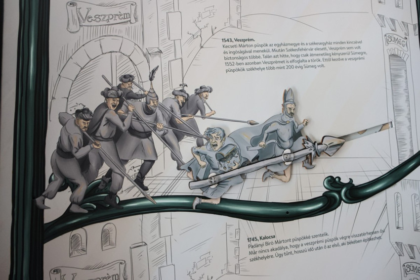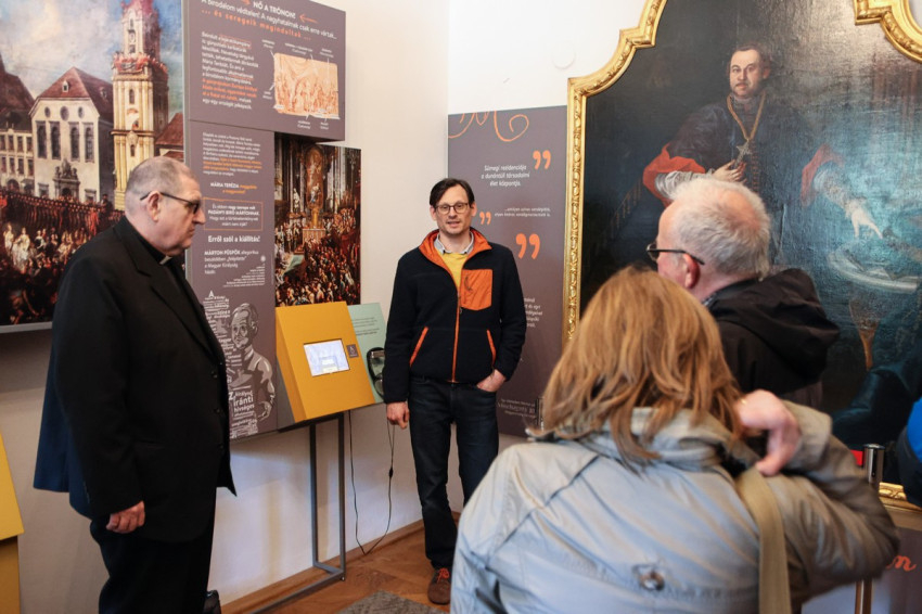 A program a megújult püspöki palotában folytatódott, amely – mint a kiállítás kurátorai, Nagy Veronika és Gaylhoffer-Kovács Gábor művészettörténészek elmondták – nemcsak a magyarországi barokk építészet kiemelkedő emléke, hanem építtetőjén keresztül igazi barokk történetet mesél el az ország újjászületésének nagy korszakából. A tárlatvezetők nagy szakmai tudással és érdekfeszítő, humoros előadásmódban mesélték el a palota valóban izgalmas átépítésein túl Padányi Biró Márton püspök felemelkedésének és mellőzésének történetét. A kiállítás a püspök személyes sorsán keresztül mutatja be a palota múltját, a barokk korszak világképét, a sümegi mindennapokat és a főpásztor karrierjét is meghatározó európai politikát.