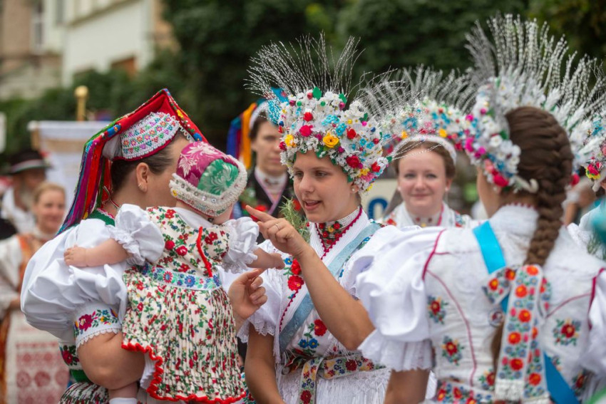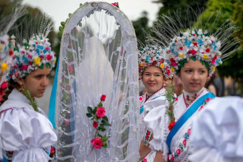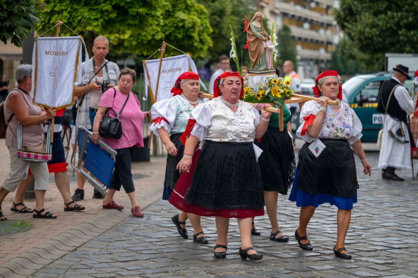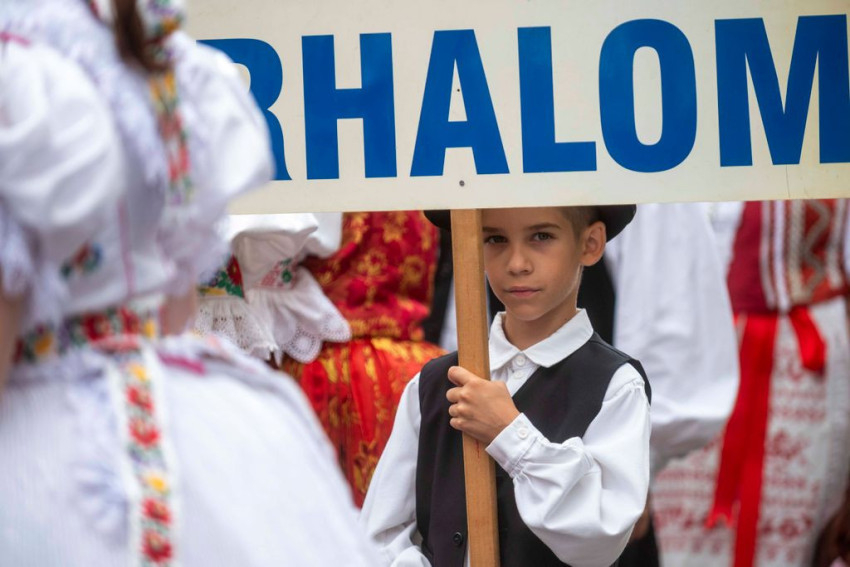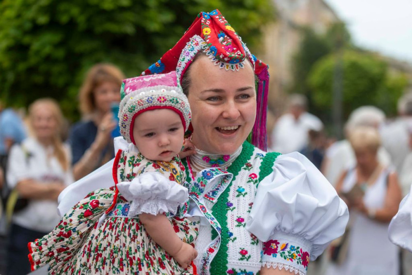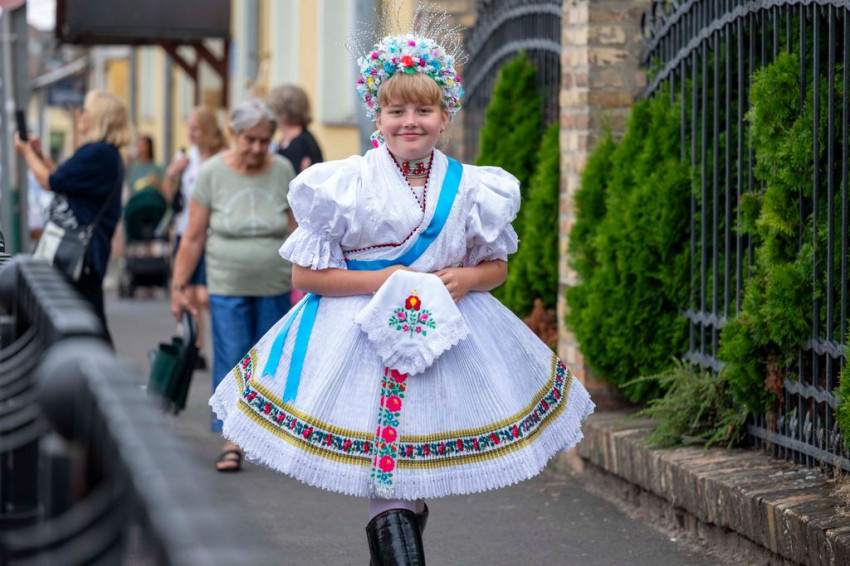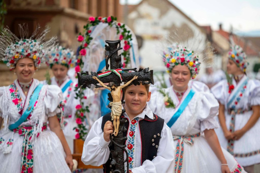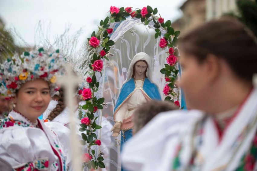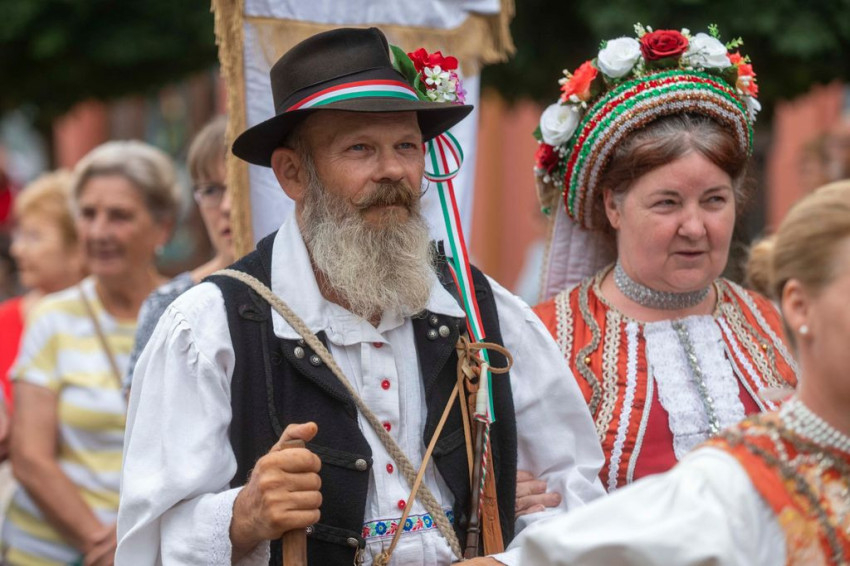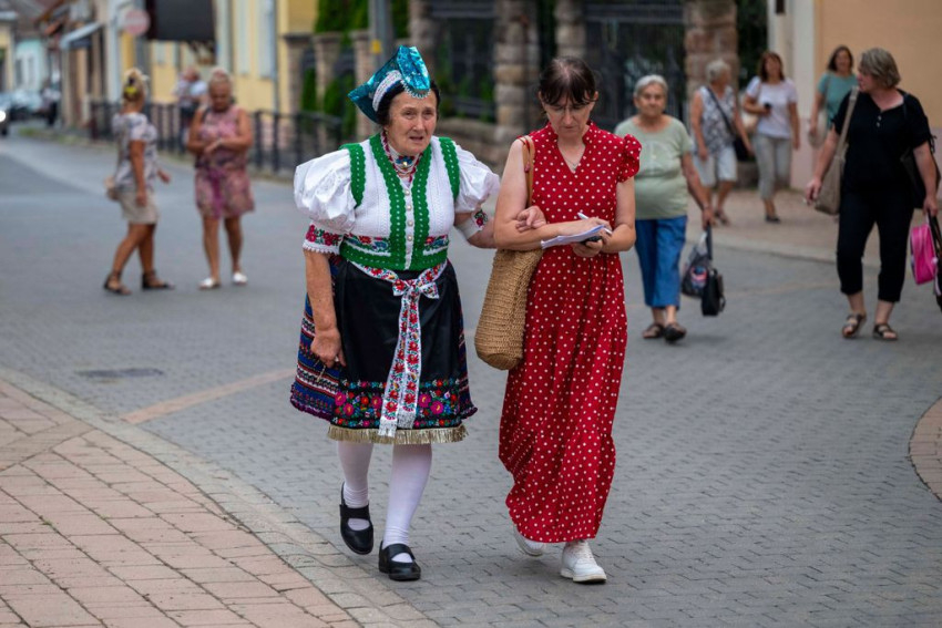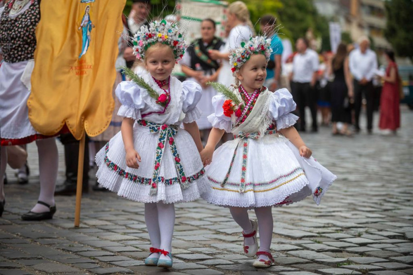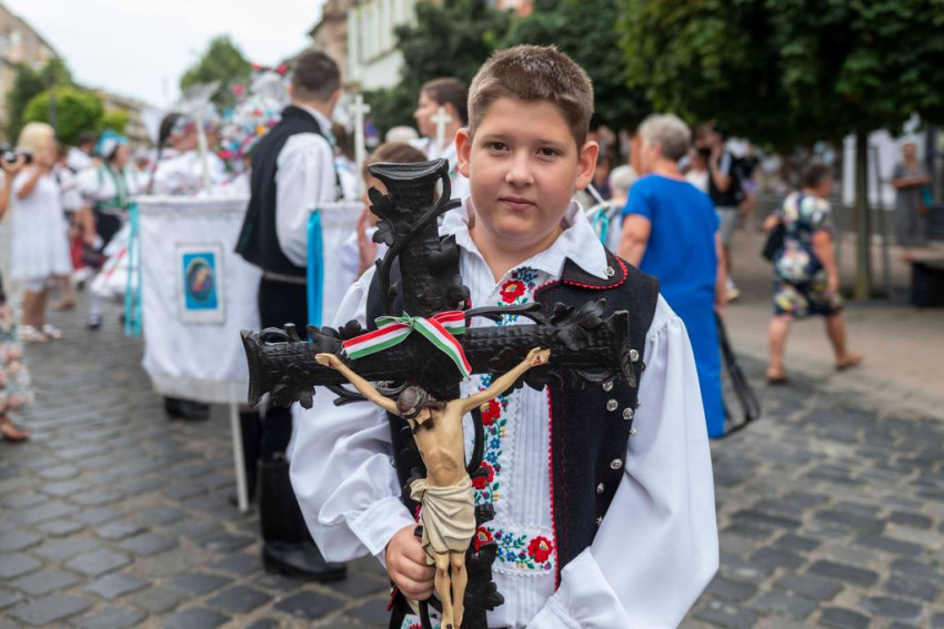 A gyönyörű népviseletbe öltözött búcsújáró menet vasárnap kora délelőtt a Szentháromság-főplébániatemplomtól indult el az ünnepi mise helyszínére, a Palóc liget szabadtéri színpadához.
