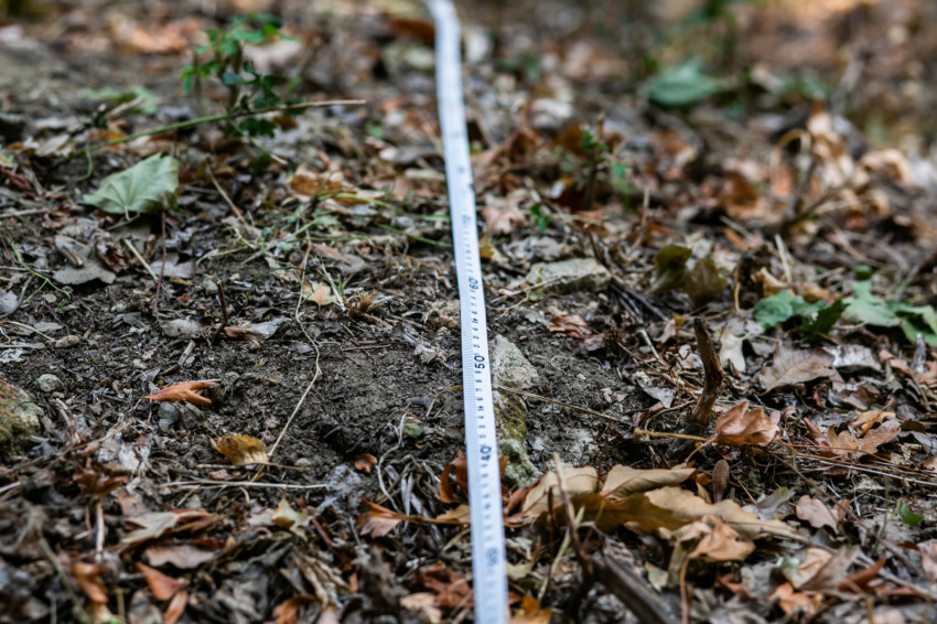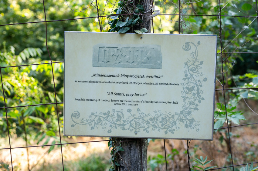 Mórocz Viktor a lágyan hullámzó terep változó kiterjedésű lankáira, szintkülönbségeire, az egykor egymást érő terek – talajradarral kutatott – körvonalaira hívja fel a figyelmet. Lábunk alatt egy korábban felnyitott, mára visszatakart rész a káptalanterem padlózatát rejti. Arrébb az egykori pince bemélyülése sejlik, amelyet vastag falak öveznek az avarral borított föld alatt. Innen nézve még jobban látszik, milyen tekintélyes lehetett az elhordott kolostorépület. És arrébb, a fáknál, a még meg nem tisztított részeken is további helyiségek sejthetők.