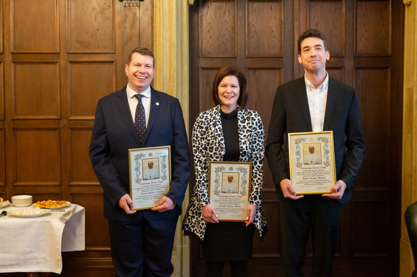 Ünnepélyes pápai áldásban részesült Hernádi-Várbíró Anita, a Lounge Event Kft. divízióvezetője; Újvári Sándor, a Miniszterelnök-helyettesi Kabinet protokollfőnöke és Botár Gergely, a Miniszterelnök-helyettesi Kabinet kommunikációs főmunkatársa.