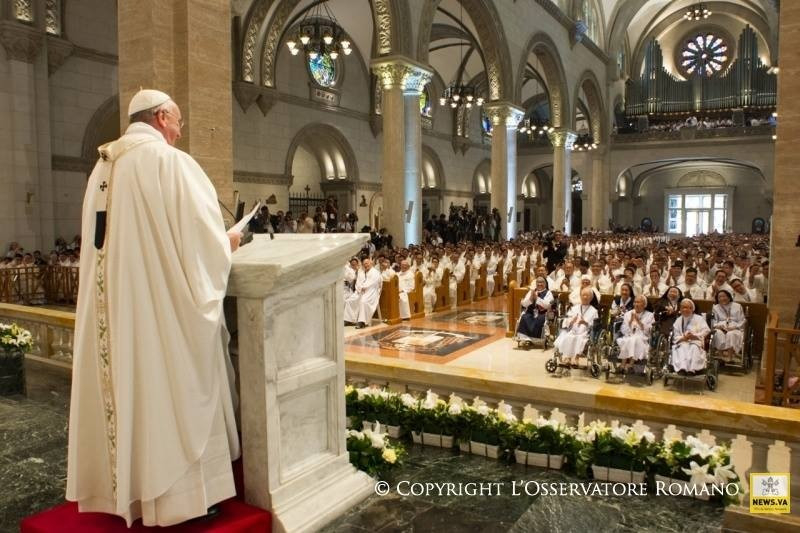 Ferenc pápa arra buzdította a fiatal papokat, a szeminaristákat, a szerzetesi és az Istennek szentelt élet többi fiatal képviselőjét, hogy osszák meg főként a kortársaikkal a Krisztus és egyháza iránti lelkesedésüket és örömüket. „Legyetek közöttük, bátorítsátok őket a szegénység, a korrupció és más nehézségek okozta elbátortalanodásukban.”