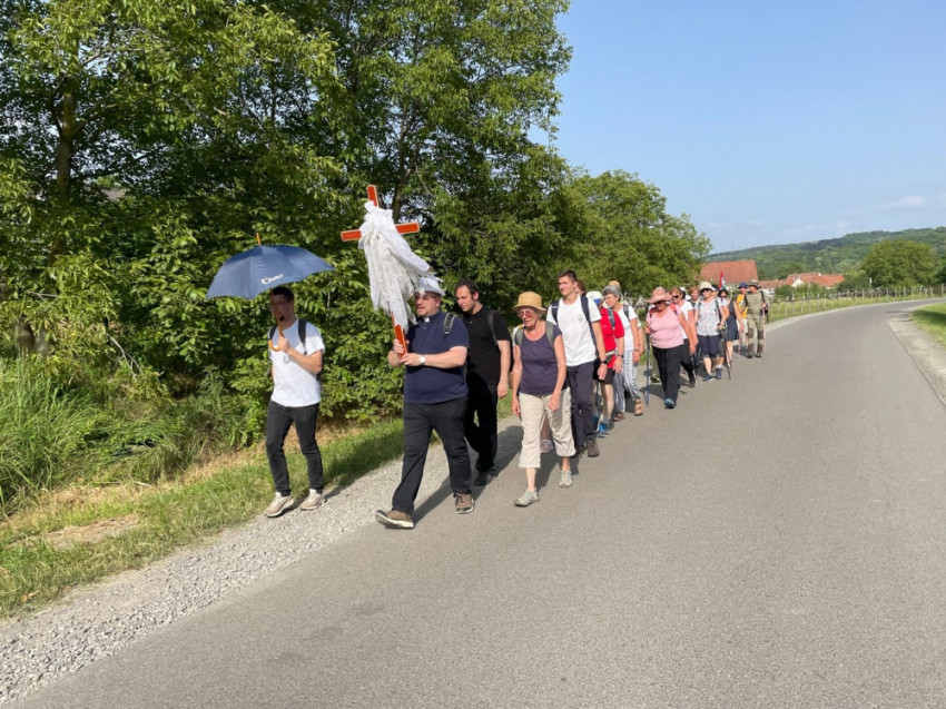 Életünkben folyamatosan úton vagyunk, felgyorsult világunkban szüntelenül rohanunk valahová – hangsúlyozta szentbeszédében Dallos Tamás komlói plébános, akinek a neve szintén felkerült a zarándokkereszt egyik szalagjára –, ugyanakkor sehol sem vagyunk ott igazán. Ma zarándokúton vagyunk, ami lényegileg más, mint a mindennapok céltalan rohanása, mert pontos értelme van. Ezen a földön nincs maradandó hazánk: eljövendő hazánk után vágyakozunk (vö. Zsid 13,14). Az Ószövetségben láthatjuk, például az egyiptomi kivonulás történetében, hogy Isten és ember kapcsolata gyakran a hosszú közös úton, közös vándorlás folyamán alakul ki, és lép bensőségesebb szintre. Isten együtt járja népével a vándorutat, vele van és megoltalmazza, célt és irányt ad haladásának. Saját életünkben ugyanezt a feszültséget, keresést, várakozást hordozzuk. Várjuk Isten útmutatását az állandó haza felé vivő úton. Jézus pedig azt mondja, azért megy vissza az Atyához, hogy helyet készítsen számunkra (vö. Jn 14,2).