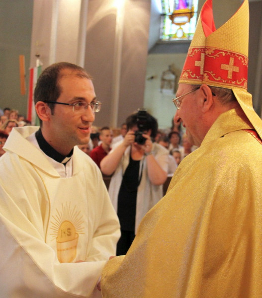 Vízi János, a római Pápai Magyar Intézet növendéke egy zsoltáridézetet választott papi jelmondatául: „Uram, én a te szolgád vagyok.” (Zsolt 116,16) A szentelő püspök ebből kiindulva a szolgálatról elmélkedett. A mai világban a szolgálat nem divatos magatartás, negatív képzetek társulnak hozzá: kiszolgálás, szolgalelkűség, kiszolgáltatottság. Ezzel szemben – mondta a püspök – a szolgálat az Egyházban Jézus követése, aki „nem azért jött, hogy neki szolgáljanak, hanem hogy ő szolgáljon, és életét adja mindenkiért” (Mt 20,28). A pap személyén keresztül Jézus újra kimondja az Atyának, hogy „Értük szentelem magam” (Jn 17,19).