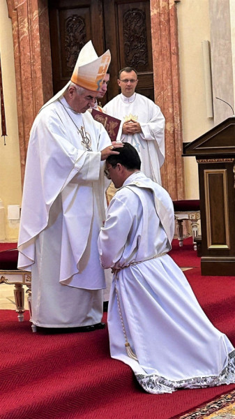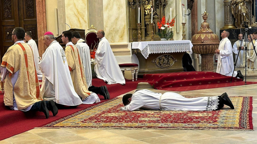 A papjelölt a szentelő püspök elé térdelt, aki két kezét a diakónus fejére helyezve csendben imádkozott, átadva neki a lelki hatalmat.