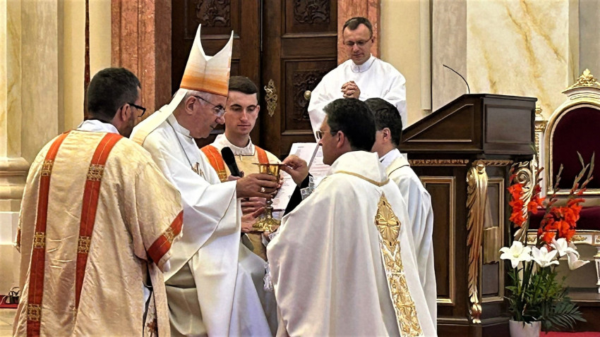 Ezt követően az új áldozópap felöltötte a stólát és a miseruhát, majd ismét letérdelt a megyéspüspök elé, aki megkente kezét a szent krizmával, és átadta a papi szolgálat liturgikus eszközeit – a paténát és a kelyhet – Isten népének áldozati adományaival, a kenyérrel és a borral.
