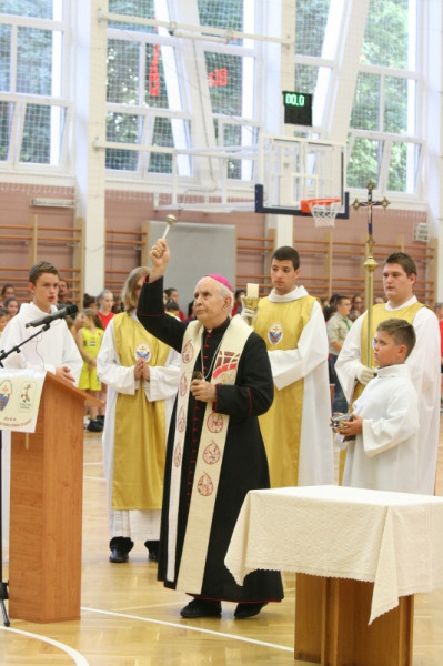 A beszédek után az ünnepélyes szalagátvágás következett, majd Bosák Nándor megyéspüspök megáldotta az épületet. A főpásztor felhívta a figyelmet arra, hogy amikor az egyház megáld egy emberi munkát, épületet, tevékenységet, abban mindig kétirányú gondolat fogalmazódik meg. Egyrészt a köszönet azért a munkáért, amit az ember az Istentől kapott képességek és adottságok alapján elvégezhetett, másrészt az Isten dicsőségét viszonozzuk azzal, hogy a Teremtő képességet adott az embereknek, hogy a világot alkotó, fenntartó tevékenységét folytathatja. Az összefogásból született tornaterem megépülése azt hirdeti, hogy ha a jó ügy érdekében összefognak a társadalom különböző szervezetei, intézményei, akkor gazdag eredményt tudnak elérni. Az áldásban ezért az összefogásért, a jó szándékért is köszönetet mondunk, tette hozzá a főpásztor; majd kérte Isten áldását mindarra, ami az új épületben történik és történni fog, a szellemi, testi és lelki gazdagodásra, az összefogásra.